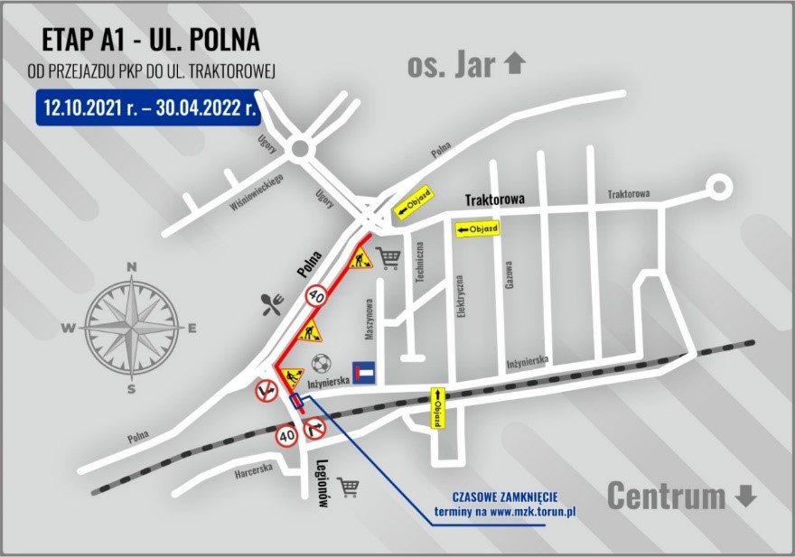 Dojście do zewnętrzej siłowni oraz Orlika będzie możliwe tylko od strony ul. Inżynierskiej i ul. Maszynowej. W chwili zamknięcia skrzyżowania z ul. Inżynierską, objazd do ul. Legionów poprowadzony zostanie ul. Elektryczną – Traktorową – Polną.
