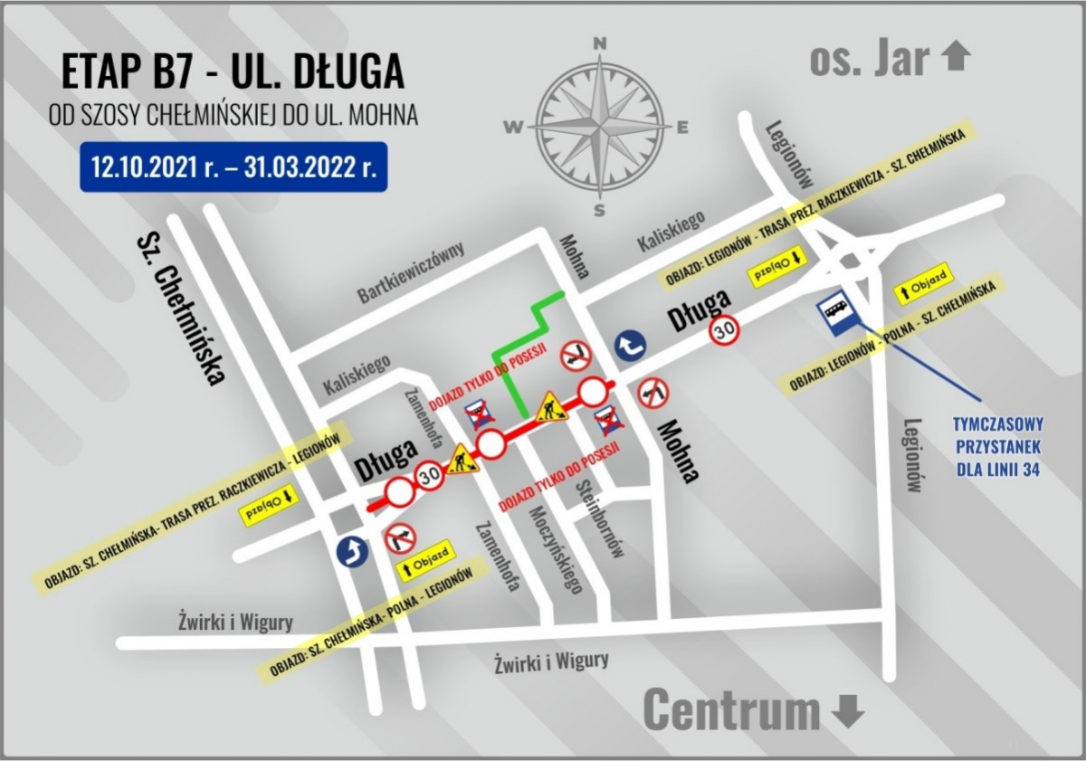 Prace na odcinku ul. Długiej od Szosy Chełmińskiej do ul. Mohna będą realizowane przy całkowitym zamknięciu ruchu dla pojazdów. Wyjątek będą stanowiły dojazdy do posesji znajdujących się po północnej stronie ul. Długiej. Dojazdy dla mieszkańców ulic: Boboli, Zamenhofa, Moczyńskiego, Steinbornów znajdujących się po południowej stronie ul. Długiej będą zapewnione od ul. Żwirki i Wigury.