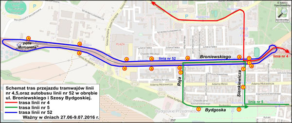 Na odcinku od Motoareany do Sienkiewicza kursować będą autobusy linii nr 52. Autobusy zatrzymywać się będą na przystankach: Sienkiewicza, Reja, Osiedle Zieleniec, Plac Skalskiego, Szosa Bydgoska i Motoarena.