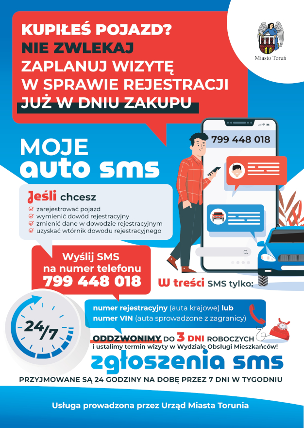Wydział Obsługi Mieszkańców Urzędu Miasta Torunia pragnie poinformować, iż od dnia 1 stycznia 2024 r. wprowadzony został obowiązek złożenia wniosku o rejestrację pojazdu. W następstwie nowelizacji przepisów właściciel pojazdu ma 30 dni od dnia nabycia pojazdu na złożenie wniosku o jego rejestrację (w przypadku przedsiębiorców prowadzących działalność w zakresie obrotu pojazdami termin ten wynosi 90 dni). Zważywszy na powyższe terminy nie warto odkładać umówienia wizyty na ostatnią chwilę. Zachęcamy do skorzystania z aplikacji Moje Auto SMS. Aby umówić wizytę należy wysłać wiadomość z danymi pojazdu, którego ma dotyczyć wizyta w Wydziale Obsługi Mieszkańców na specjalny numer: 799 448 018.