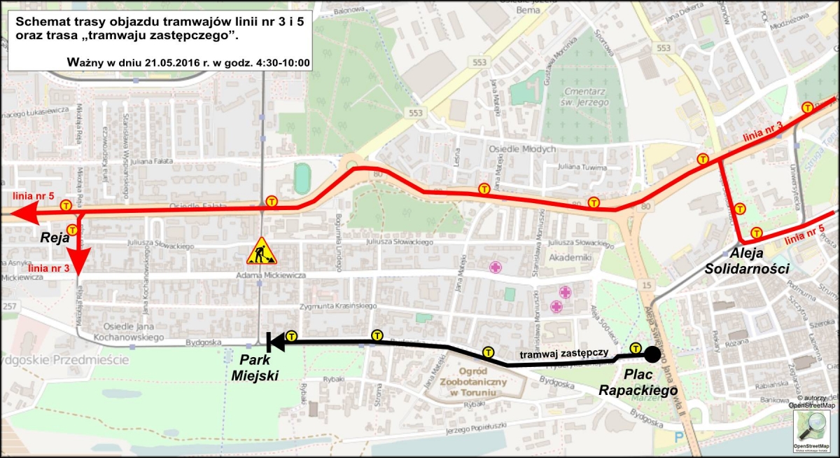 W związku z awarią rozjazdu torowego w ul. Sienkiewicza w sobotę 21 maja od godz. 4:30 do 10:00 tramwaje linii nr 3 i 5 jadące w kierunku Reja i Motoareny pojadą objazdem od Alei Solidarności ul. Czerwona Droga, Kraszewskiego i Bema. Ruch tramwajów w kierunku przeciwnym odbywać się będzie bez zmian.