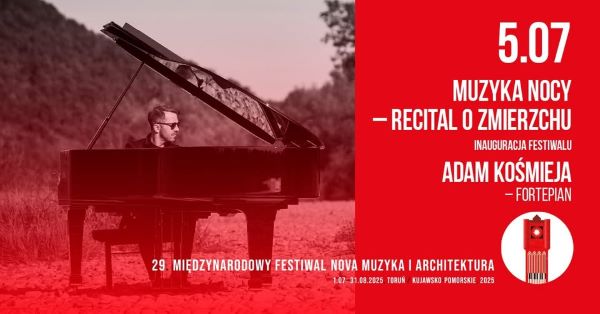 Koncert „Muzyka nocy – recital o zmierzchu” zainauguruje 29. Międzynarodowy Festiwal Nova Muzyka i Architektura. Wystąpi Adam Kośmieja – fortepian. W programie m.in. kompozycje: L. van Beethovena, C. Debussy’ego, F. Chopina, E. Stiego, P. Glassa, S. ten Holta. Wstęp wolny.