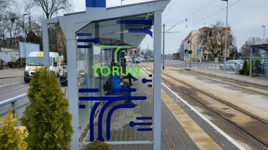 14 wiat wzdłuż nowej linii tramwajowej zostało oklejonych promocyjnymi grafikami "Toruń Miasto Dobrych Połączeń".