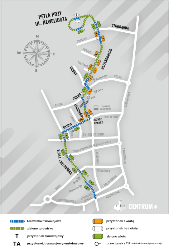 - na nowej pętli przy ul. Heweliusza (w kierunku centrum dla wsiadających).
