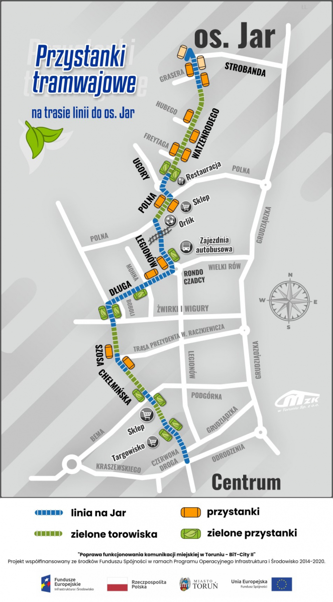 Nowa linia tramwajowa przebiegać będzie z centrum Szosą Chełmińską, ul. Długą, Legionów, Polną, Ugory i Watzenrodego do nawrotu w ul. Strobanda. Zapewni ona dodatkowy transport dla mieszkańców dynamicznie rozwijającego się osiedla Jar. Co ważne - będzie to transport nie tylko szybki, ale także ekologiczny, nie emitujący spalin.