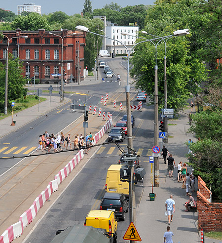 Tymczasowa sygnalizacja świetlna obsługująca przejście na Wałach gen Sikorskiego, na wysokości budynku nr 10, zostanie nieznacznie przesunięta w kierunku północnym, tak aby obsługiwać ruch odbywający się teraz na "górnej", północnej nitce Wałów.