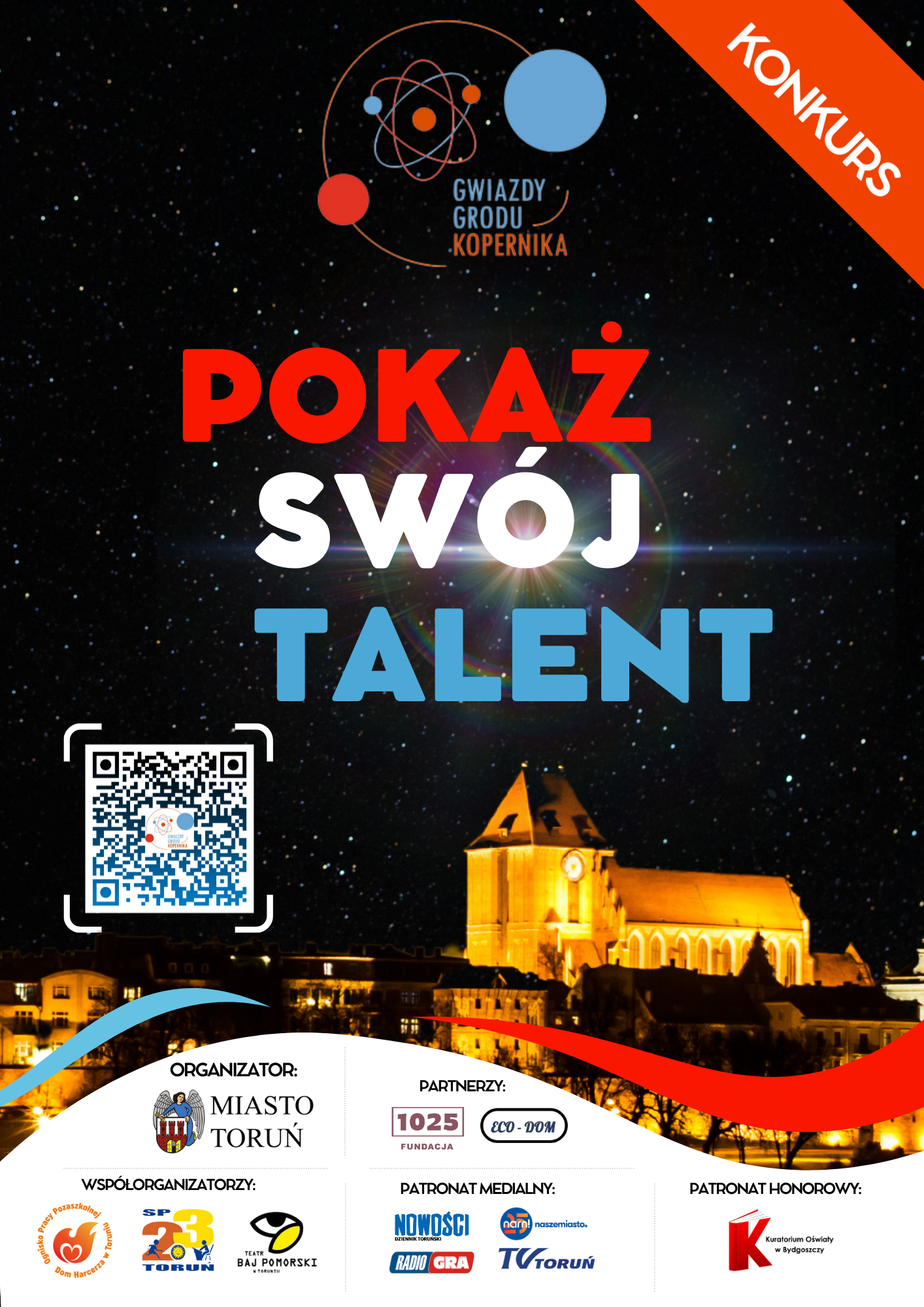 Gmina Miasta Toruń, jako organizator Konkursu GWIAZDY GRODU KOPERNIKA wraz z współorganizatorami konkursu: Szkołą Podstawową nr 23 im. Kawalerów Orderu Uśmiechu w Toruniu, Ogniskiem Pracy Pozaszkolnej Dom Harcerza w Toruniu i Teatrem Baj Pomorski w Toruniu zapraszają do udziału w III edycji miejskiego KONKURSU „GWIAZDY GRODU KOPERNIKA”.