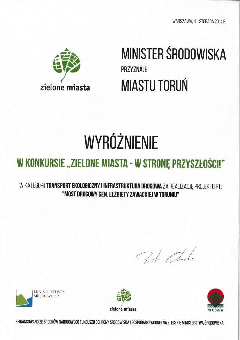 W dniu 4.11.2014 r. Minister Środowiska przyznał Miastu Toruń wyróżnienie w konkursie „Zielone Miasta – w stronę przyszłości!”, w kategorii transport ekologiczny i infrastruktura drogowa za realizację projektu pn.: „Most drogowy gen. Elżbiety Zawackiej w Toruniu”.