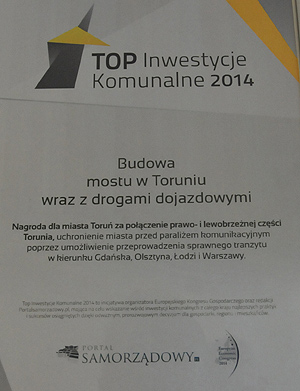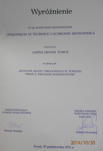 Gmina Miasta Toruń otrzymała wyróżnienie w konkursie „Osiągnięcia w technice i ochronie środowiska” za realizację inwestycji „Budowa mostu drogowego w Toruniu wraz z drogami dojazdowymi”.