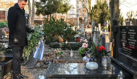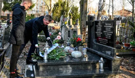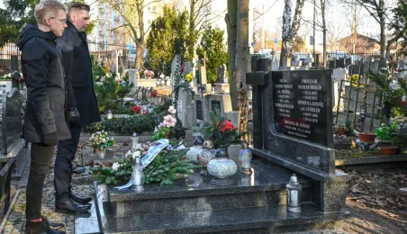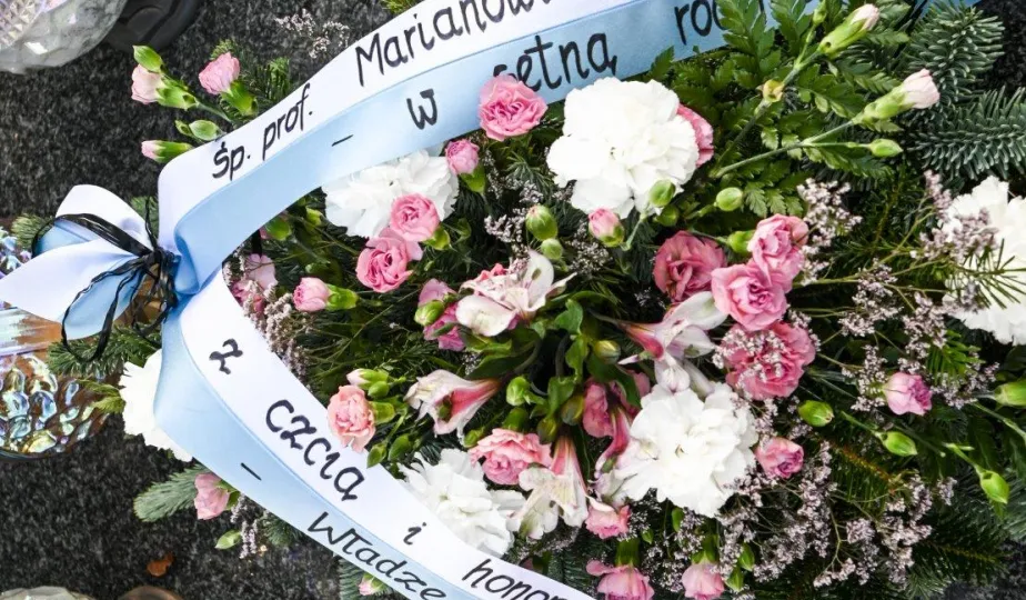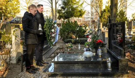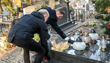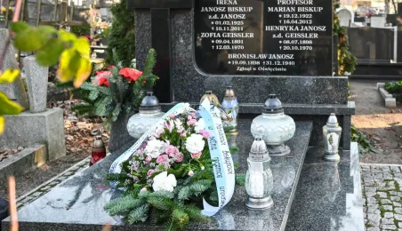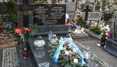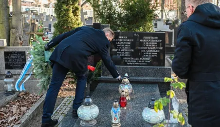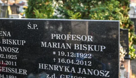 Z okazji 100. rocznicy urodzin honorowego obywatela miasta, śp. prof. Mariana Biskupa, 19 grudnia 2022 r. na grobie na cmentarzu św. Jerzego zastępca prezydenta miasta Adrian Mól i dyrektor Biura Rady Miasta Marek Wiliński złożyli kwiaty. Fot. Lech Kamiński