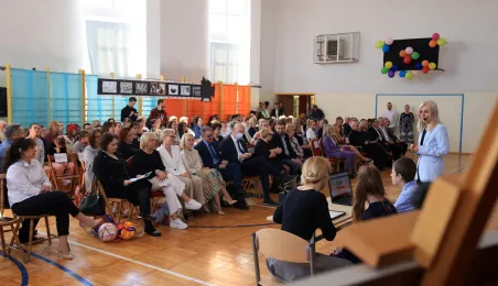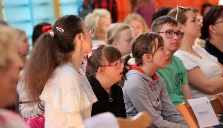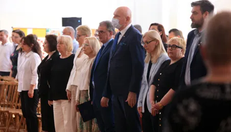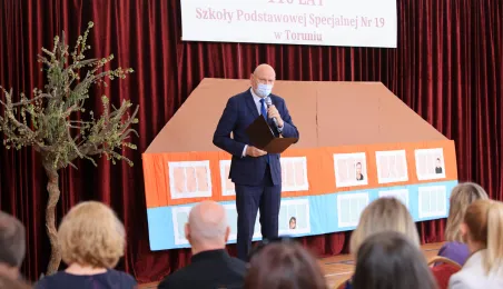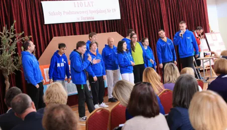 Przy Szkole Podstawowej nr 19 w Toruniu miasto chce wybudować basen rehabilitacyjny. Taką radosną informacje przekazał prezydent Torunia 10 maja 2023 r. podczas uroczystości z okazji 110-lecia istnienia placówki. Jubileuszowa uroczystość w siedzibie szkoły przy ul. Dziewulskiego 41 c, połączona z obchodami 8. Wojewódzkiego Dnia Godności Osoby Niepełnosprawnej Intelektualnie, zgromadziła liczne grono gości: przedstawicieli władz miasta i kuratorium, byłych i obecnych pracowników i uczniów placówki, rodziców oraz przyjaciół z toruńskiego środowiska osób niepełnosprawnych. Miasto reprezentowali prezydent Torunia Michał Zaleski, radni Rady Miasta: Krystyna Żejmo-Wysocka, Margareta Skerska-Roman i Bartosz Szymański oraz dyrektor Wydziału Edukacji Anna Łukaszewska. Fot. Sławomir Kowalski