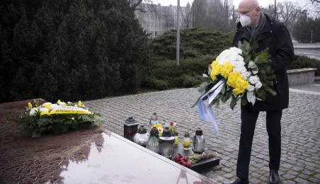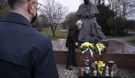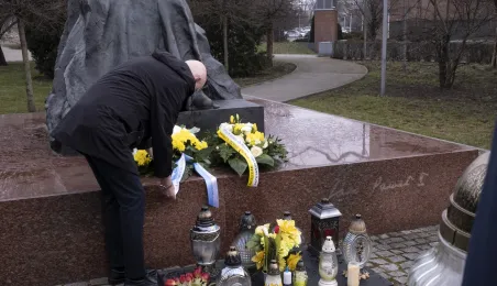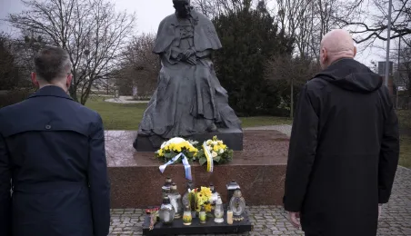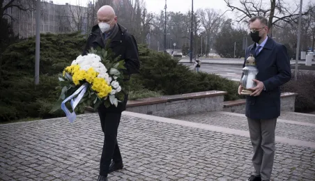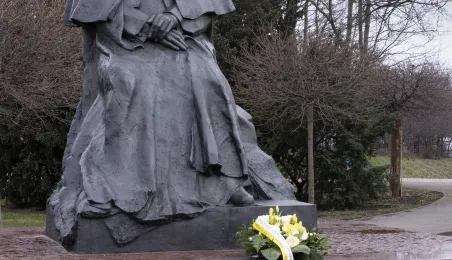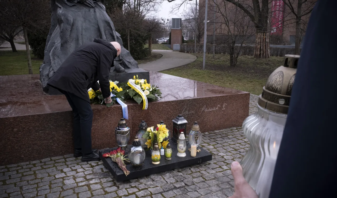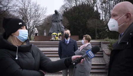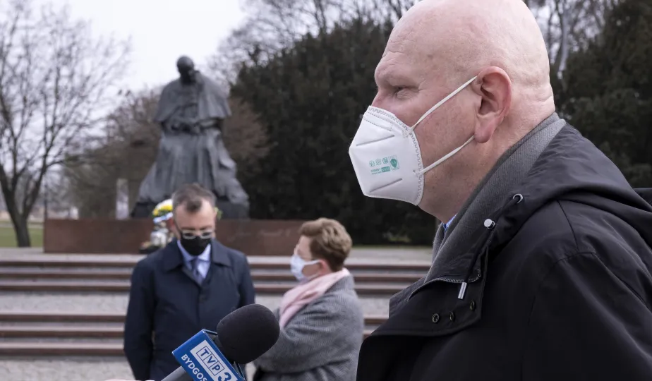 2 kwietnia 2021 r., w 16. rocznicę śmierci Jana Pawła II, kwiaty pod jego toruńskim pomnikiem złożyli prezydent Torunia Michał Zaleski i przewodniczący Rady Miasta Torunia Marcin Czyżniewski. Fot. Wojtek Szabelski