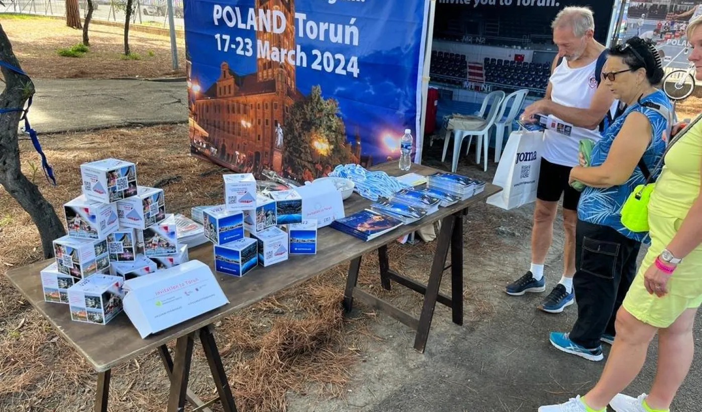 We włoskiej Pescarze od 21 września do 1 października 2023 r. odbywają się 22. Mistrzostwa Europy w Lekkoatletyce Masters, w których udział biorą - z sukcesami - reprezentanci Torunia. Toruń jako gospodarz wydarzenia w roku 2024 ma swoje stoisko, na którym są dostępne materiały o mieście, jego atrakcjach i samycm wydarzeniu. Fot. WSiR