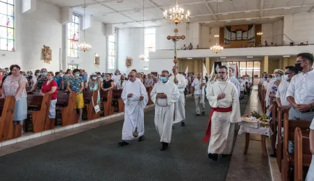 40-lecie istnienia świętuje w tym roku toruńska Parafia Świętego Maksymiliana Kolbego. Kilkudniowe obchody parafialne z tej okazji zwieńczyła uroczysta msza odpustowa odprawiona 14 sierpnia 2020 r. w świątyni na Skarpie przez Biskupa Toruńskiego ks. Wiesława Śmigla. Miasto reprezentował zastępca prezydenta Paweł Gulewski. Fot. Lech Kamiński