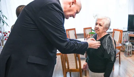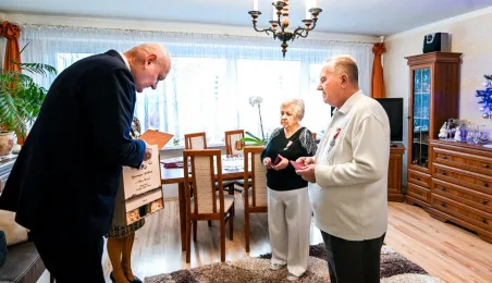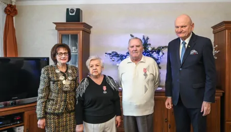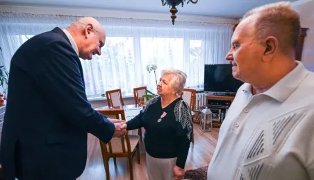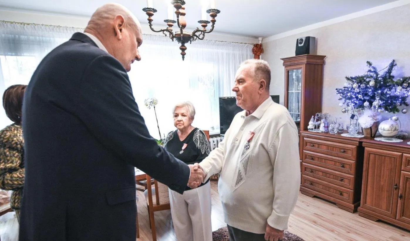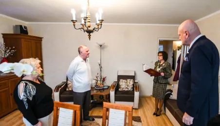 Ponad pół wieku temu związek małżeński zawarli państwo Ewa i Zdzisław Kosiorkowe. Z tej okazji prezydent wręczył jubilatom Medal za Długoletnie Pożycie Małżeńskie, wyjątkowo, ze względów zdrowonych, w ich domu. Fot. Lech Kamiński