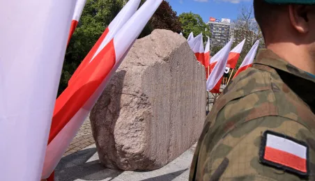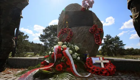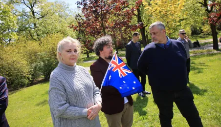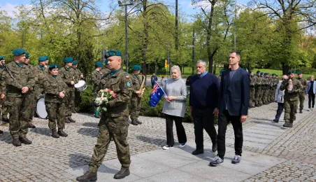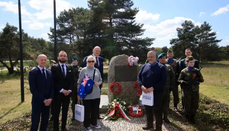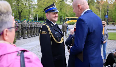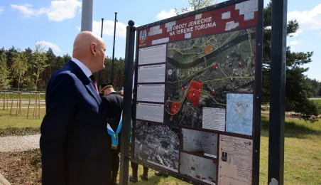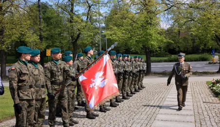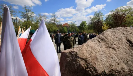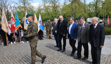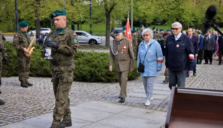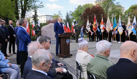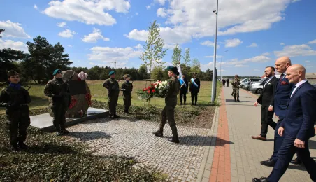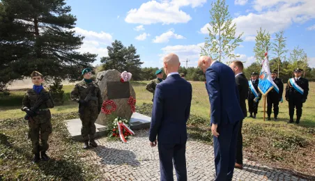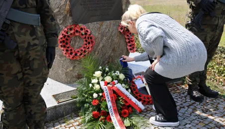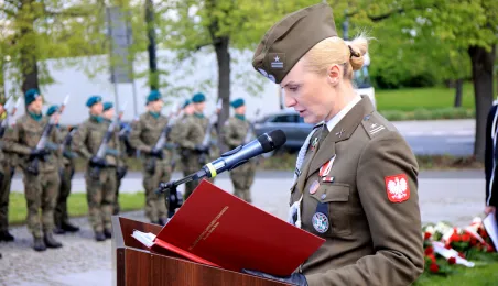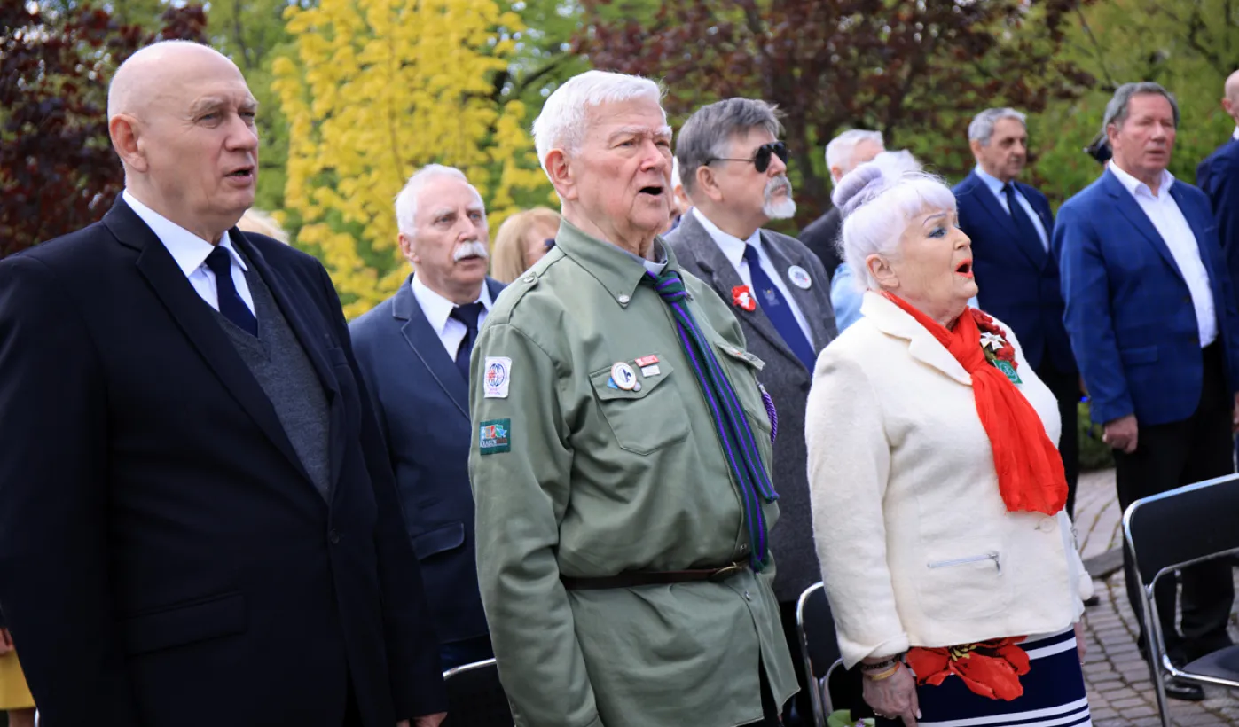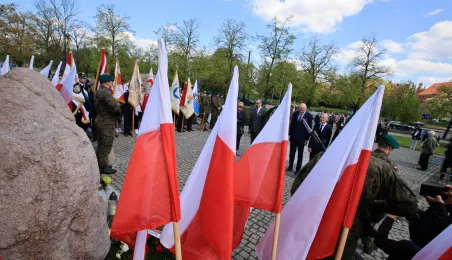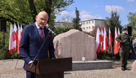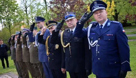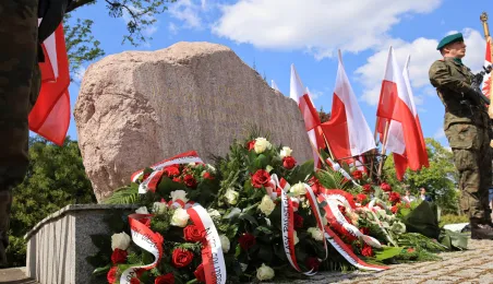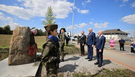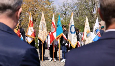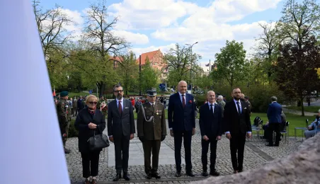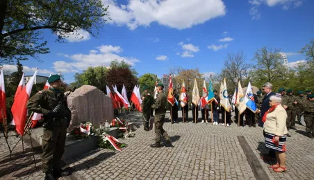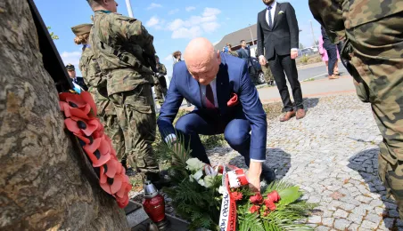 W 78. rocznicę zakończenia II wojny światowej, 8 maja 2023 r., przedstawiciele władz miasta złożyli wiązanki kwiatów w miejscach upamiętniających ofiary światowego konfliktu - pod pomnikiem Ofiar Hitleryzmu przy alei św. Jana Pawła II i pod tablicą na terenie dawnego obozu jenieckiego na osiedlu Glinki. / fot. Sławomir Kowalski