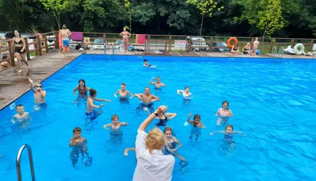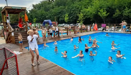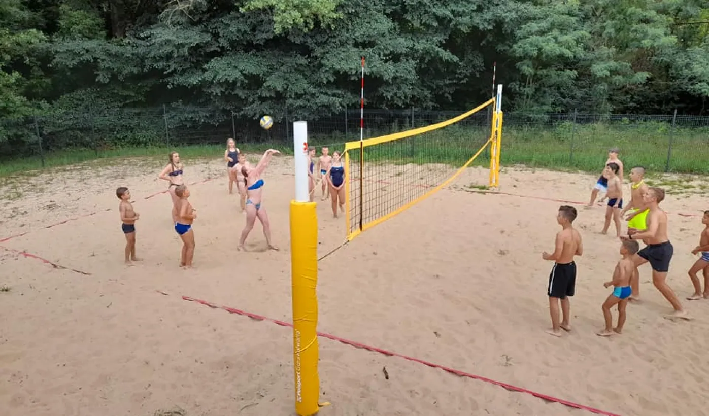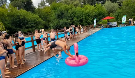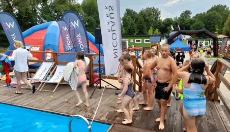 Spektakularne skoki do wody, kursy nurkowania, aquafitness, turnieje w badmintona, boule i siatkówkę plażową - to tylko część atrakcji, z których mogli skorzystać 23 lipca 2021 r. uczestnicy All Day Beach Party na basenach letnich przy Campingu Tramp przy ul. Kujawskiej. Fot. Stowarzyszenie GoSport!