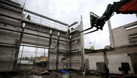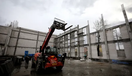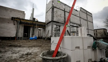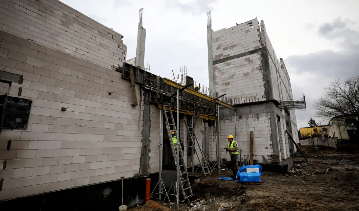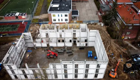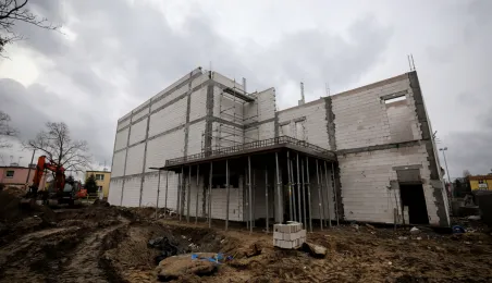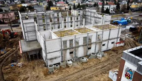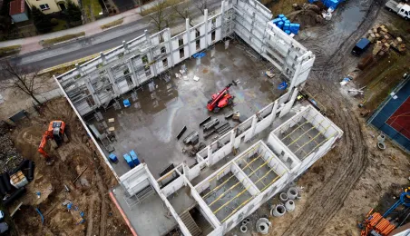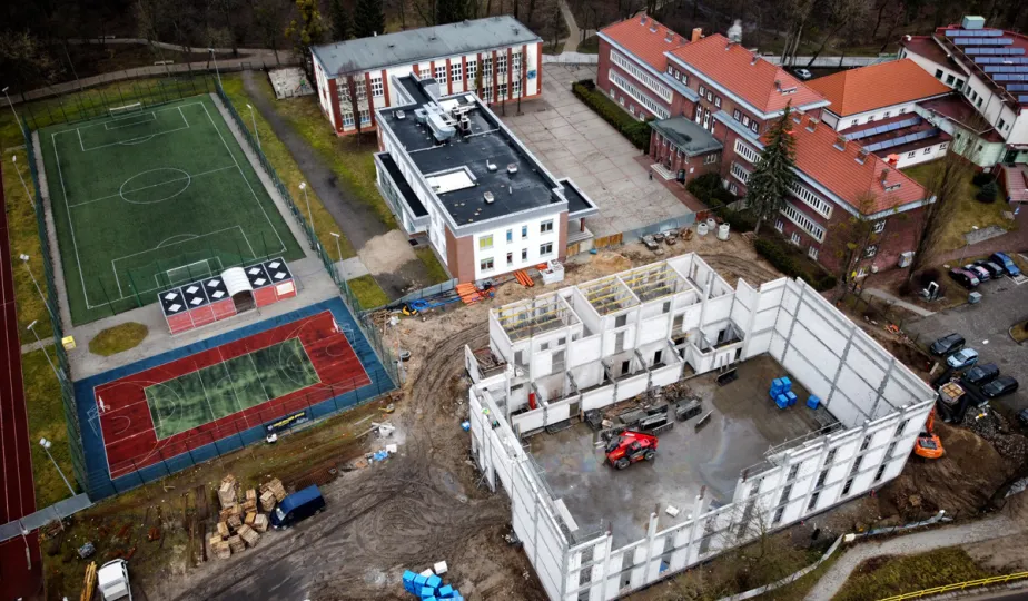 Przy Szkole Podstawowej nr 14 na toruńskich Stawkach trwa budowa pełnowymiarowej sali gimnastycznej. Jednokondygnacyjny budynek o powierzchni 1120 m kw. z dwukondygnacyjną częścią szatniowo-sanitarną, będzie połączony ze szkołą łącznikiem. Umowa z wykonawcą – firmą Hosta Group Sp. z o.o. Sp. K. z Grębocina została podpisana 20 maja 2021 r. Jej wartość to prawie 7,5 mln zł. Już w roku szkolnym 2022/2023 sala ma służyć uczniom SP nr 14. Fot. Sławomir Kowalski