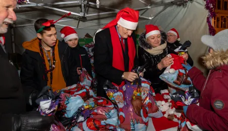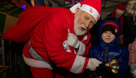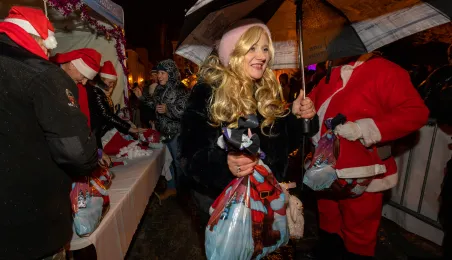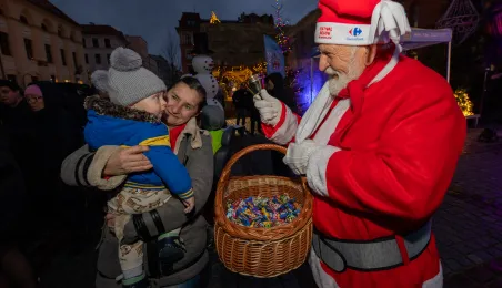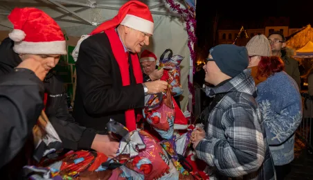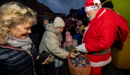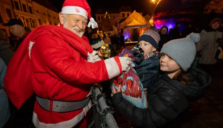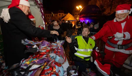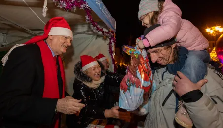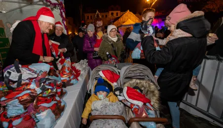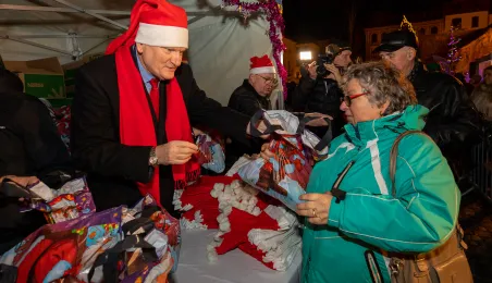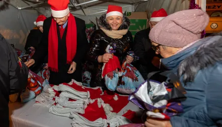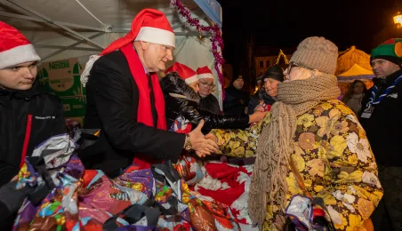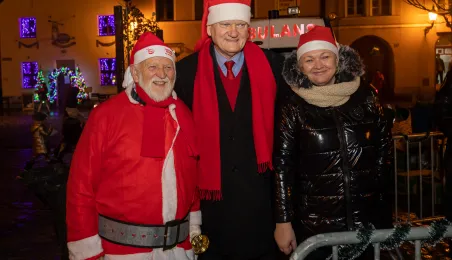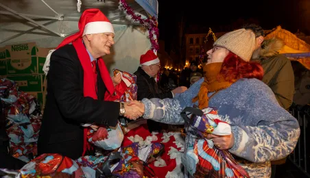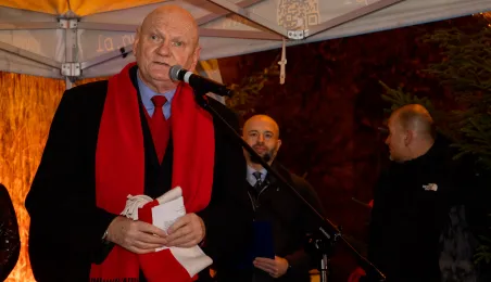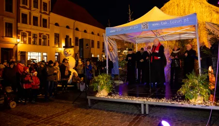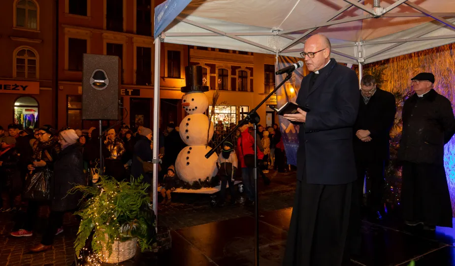 Prezydent Torunia Michał Zaleski oraz duchowni kilku kościołów, w tym rzymsko-katolickiego, grecko-katolickiego, prawosławnego i ewangelicko-augsburskiego złożyli wszystkim przybyłym na plenerową Wigilię Miejską (20 grudnia 2023 r.) bożonarodzeniowe życzenia. Fot. Agnieszka Bielecka