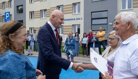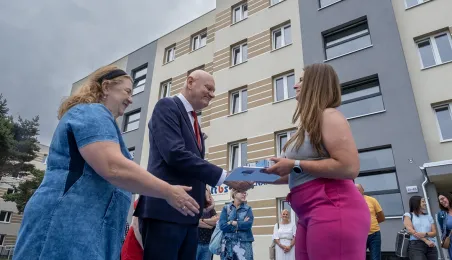 Pierwszych kilka rodzin otrzymało klucze od prezydenta Torunia Michała Zaleskiego do mieszkań w nowo powstałym budynku mieszkalnym przy ul. Poznanskiej 294 c, gdzie inwestorem jest spółka miejska Toruńskie Towarzystwo Budownictwa Społecznego. - Mam nadzieję, że to miejsce będzie dla Państwa dobrym toruńskim domem - powiedział prezydent Michał Zaleski. Fot. Wojtek Szabelski