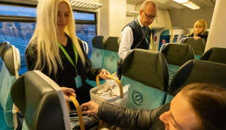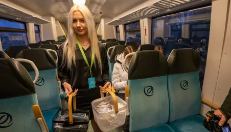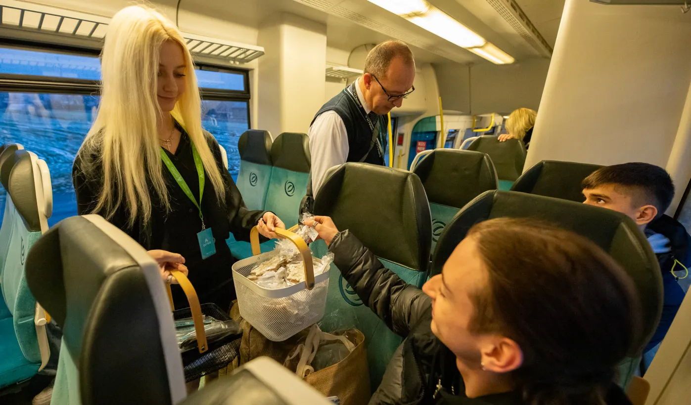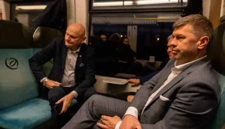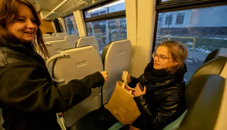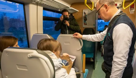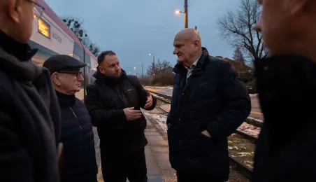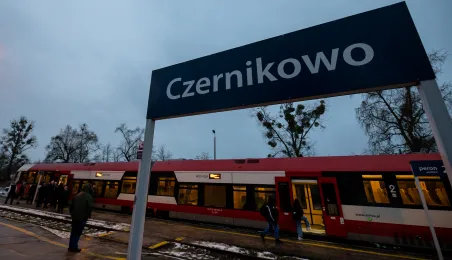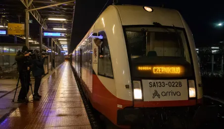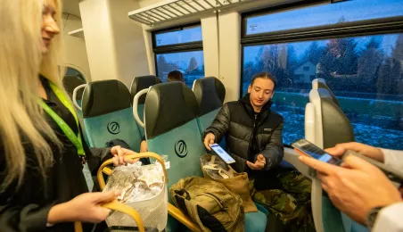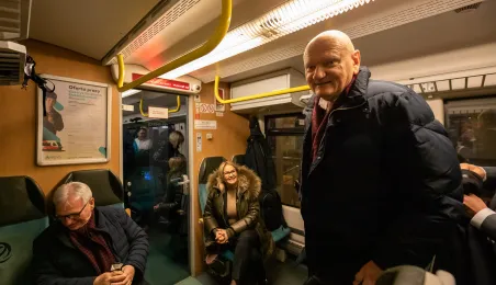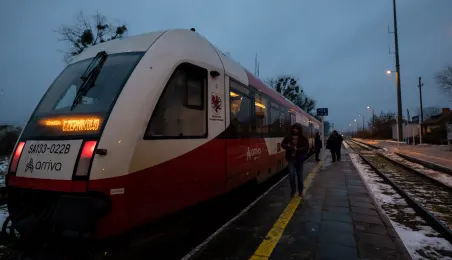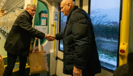 Na trasie Toruń Główny – Czernikowo kursować będzie dodatkowy pociąg. Stało się to możliwe dzięki porozumieniu samorządu województwa z gminami powiatu toruńskiego, w tym miastem Toruń, które będą wspófinansować kurs. Pierwszy, uroczysty przejazd dodatkowego pociągu odbył się wczesnym rankiem w poniedziałek 11 grudnia 2023 r. Fot. Agnieszka Bielecka