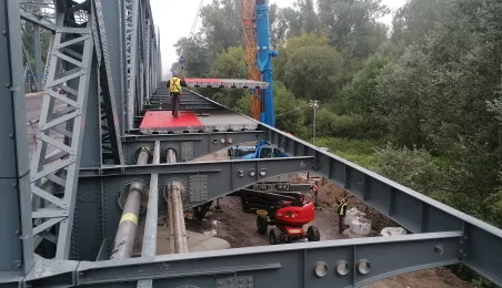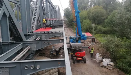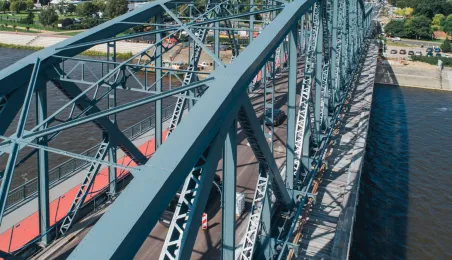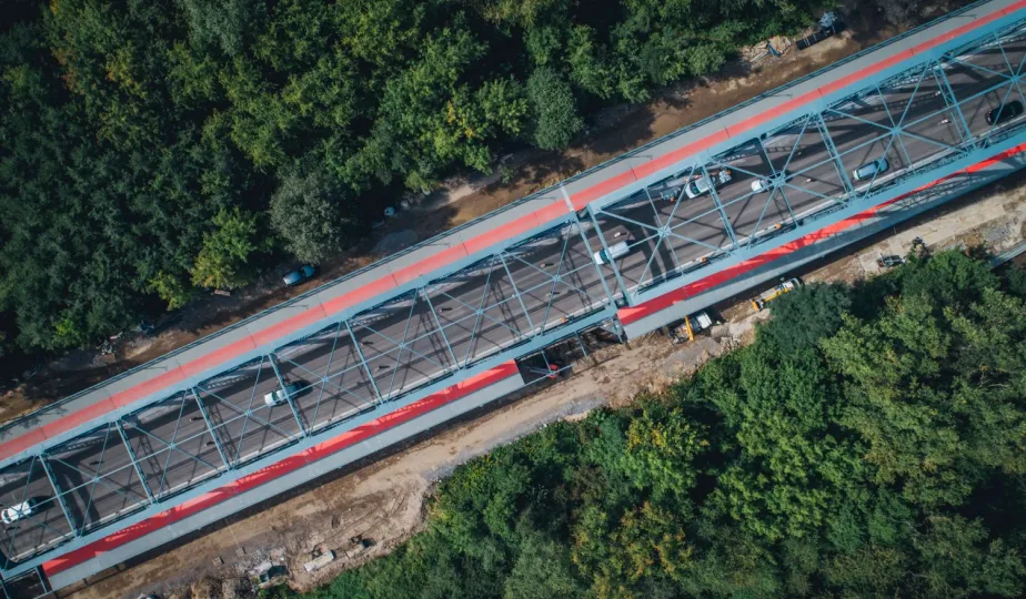 We wrześniu 2021 po wschodniej stronie mostu drogowego im. marsz. J. Piłsudskiego w Toruniu montowane są panele. Powstanie z nich ciąg pieszo-rowerowy, identyczny jak po przeciwnej, zachodniej stronie przeprawy. Fot. MZD/Błażej Antonowicz Focus Art (zdjęcia lotnicze)
