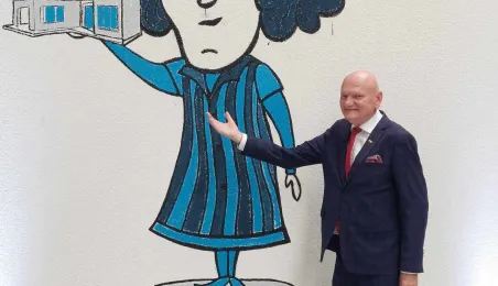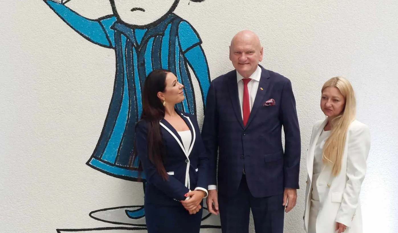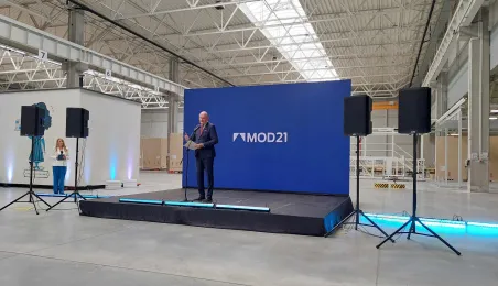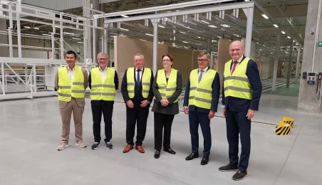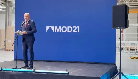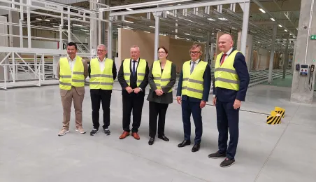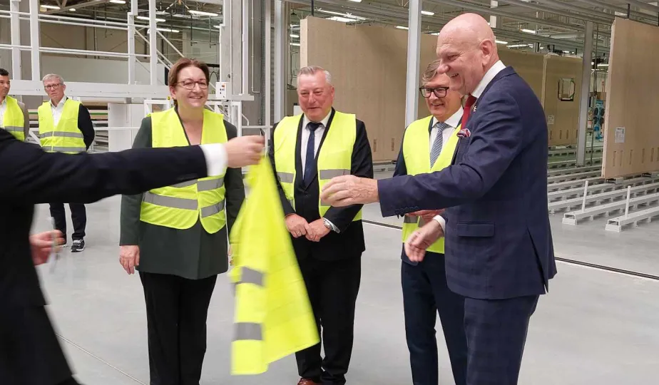 Klara Geywitz - ministra mieszkalnictwa, rozwoju miast i budownictwa Republiki Federalnej Niemiec odwiedziła 30 czerwca 2023 r. fabrykę MOD 21 w podtoruńskim Ostaszewie, w której toruńska firma ERBUD od listopada 2022 r. produkuje drewniane budynki modułowe, przede wszystkim na rynek niemiecki. Na zaproszenie zarządu fabryki gościem spotkania z panią minister był prezydent Torunia Michał Zaleski. Fot. Łukasz Szarszewski
