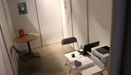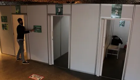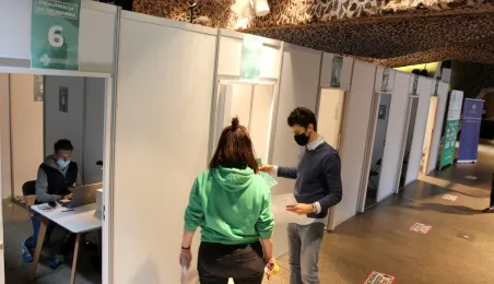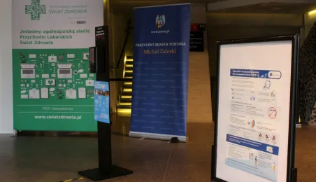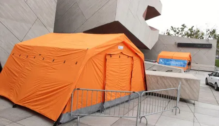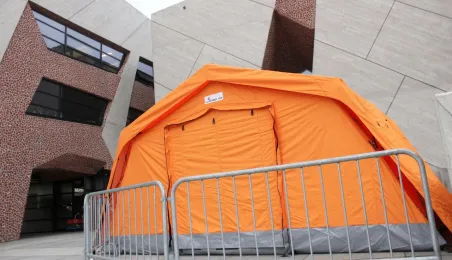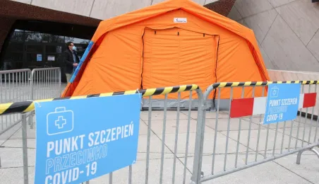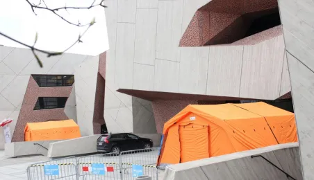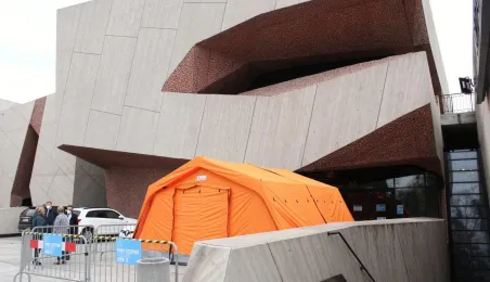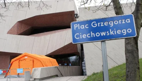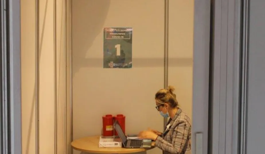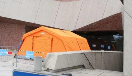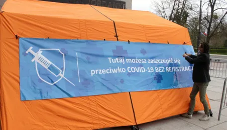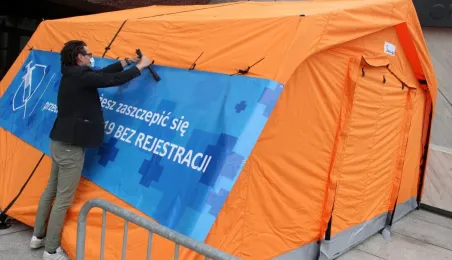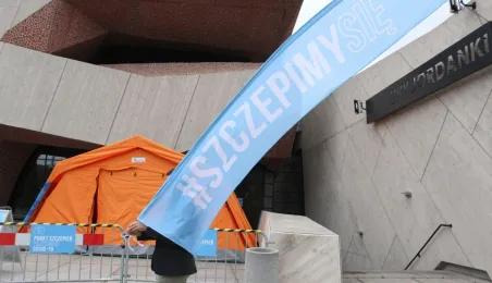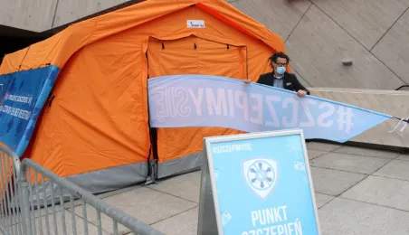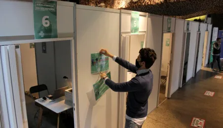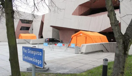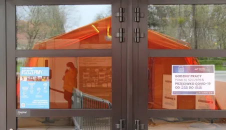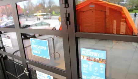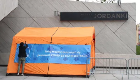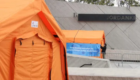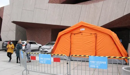 Dwa namioty przed CKK Jordanki oraz gotowe stanowiska we foyer budynku - mobilny punkt szczepień jest już gotowy. Szczepienia w ramach akcji "Zaszczep się w majówkę" będą odbywać się tam w dniach 1-4 maja 2021 r. Fot. Adam Zakrzewski