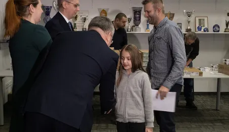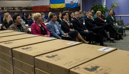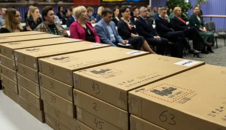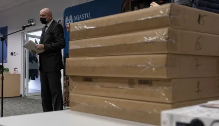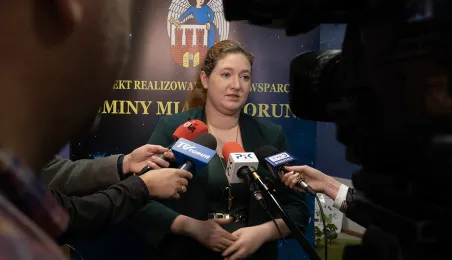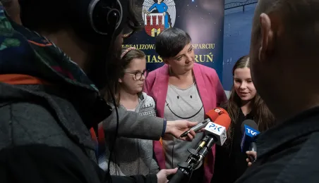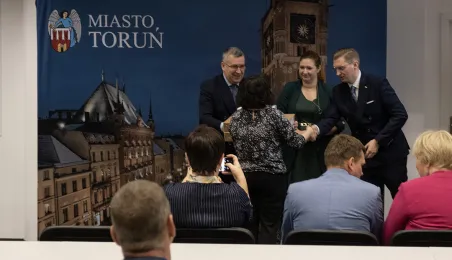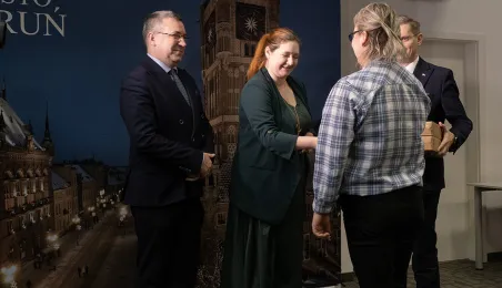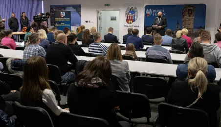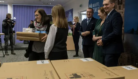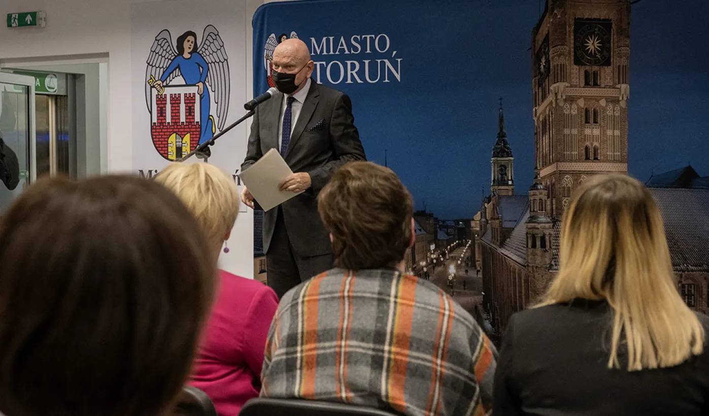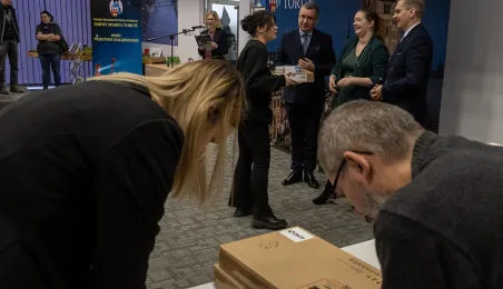 Beneficjenci projektu pn. „Wsparcie dzieci z rodzin pegeerowskich w rozwoju cyfrowym – Granty PPGR” odebrali laptopy, które mają stanowić wsparcie w nauce i rozmowy toruńskich uczniów. Spotkanie z udziałem m.in. prezydenta Michała Zaleskiego i minister Anny Gembickiej odbyło się 24 listopada 2022 r. w Przystani Toruń. Fot. Wojtek Szabelski