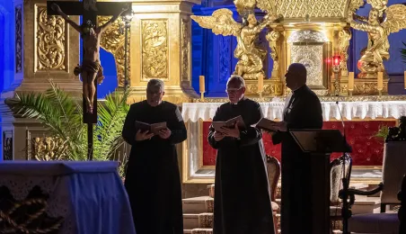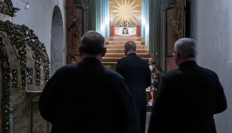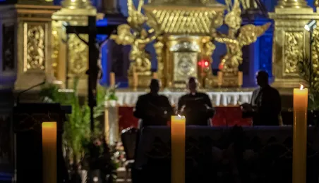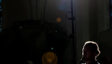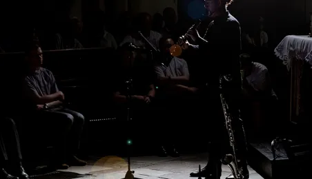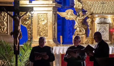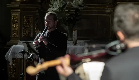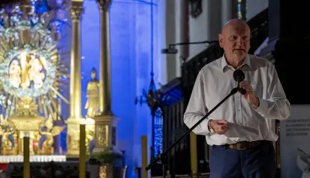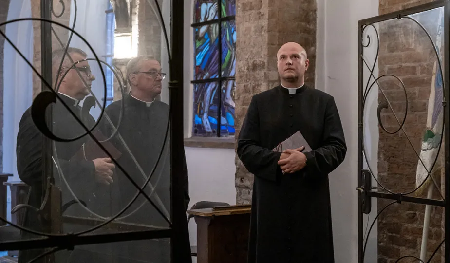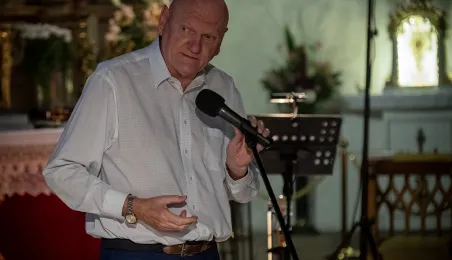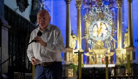 W kościele pw. Wniebowzięcia Najświętszej Marii Panny 16 sierpnia 2023 roku odbył się niezwykły koncert pt. "Gregorian Priests", łączący średniowieczny śpiew chorałowy i współczesną muzykę instrumentalną. Słuchaczy koncertu powitał prezydent Michał Zaleski. Fot. Wojtek Szabelski
