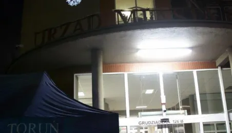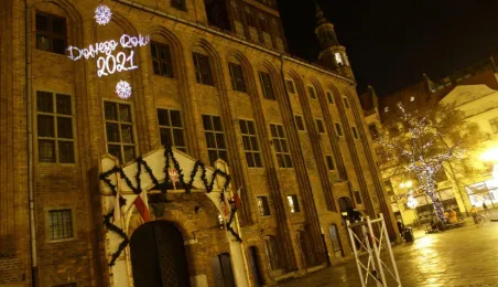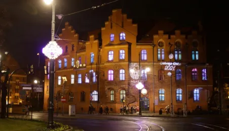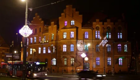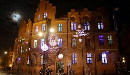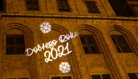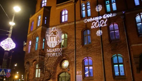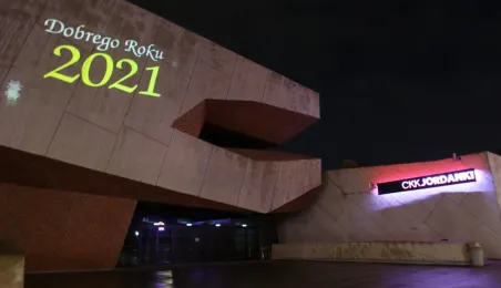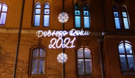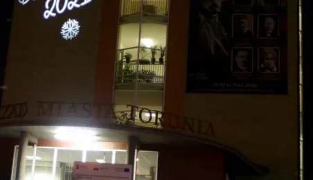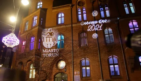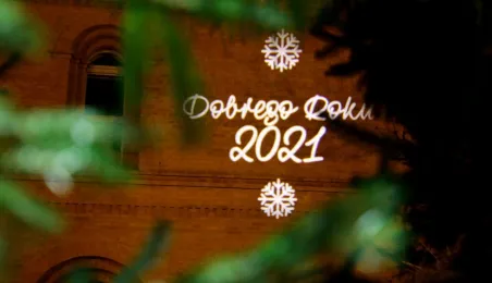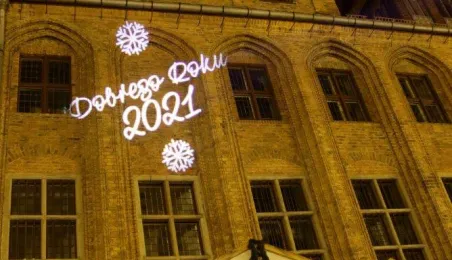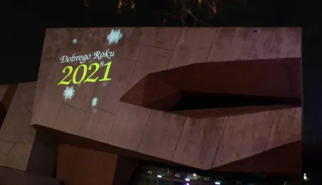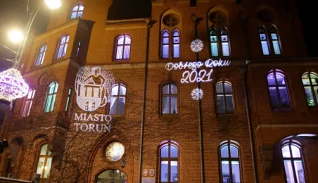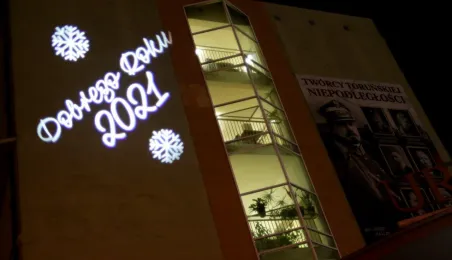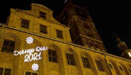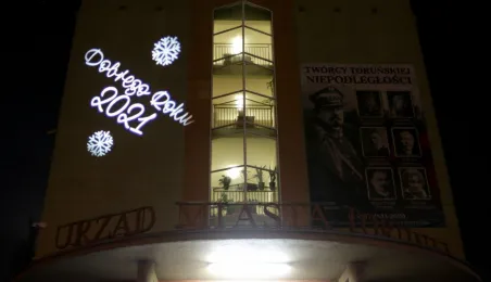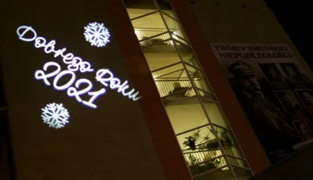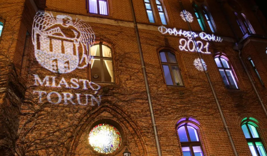Świetlne życzenia noworoczne dla mieszkańców Torunia prezentowane są od 29 grudnia 2020 r. do 3 stycznia 2021 r. na kilku budynkach miejskich. Na bryle CKK Jordanki wyświetlona jest animacja, zaś budynek UMT dodatkowo podświetlony został kilkoma kolorami. Dobre słowa na Nowy Rok przeczytamy również na Ratuszu Staromiejskim, siedzibie Fundacji Tumult na Rynku Staromiejskim oraz budynku UMT przy ul. Grudziądzkiej. Fot. Adam Zakrzewski