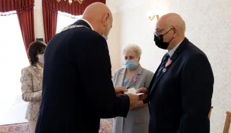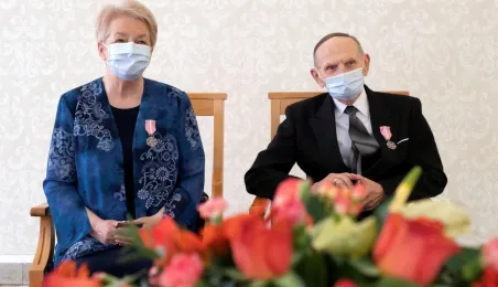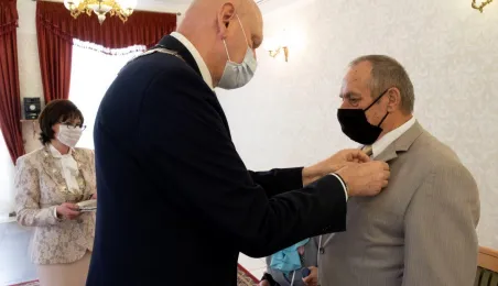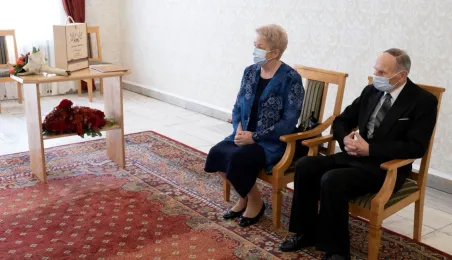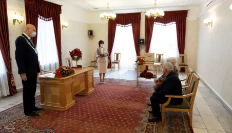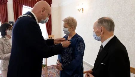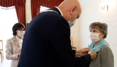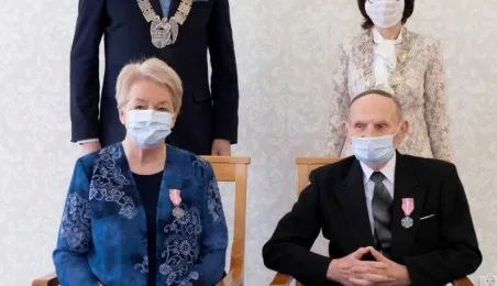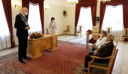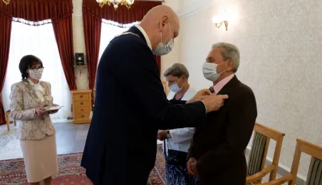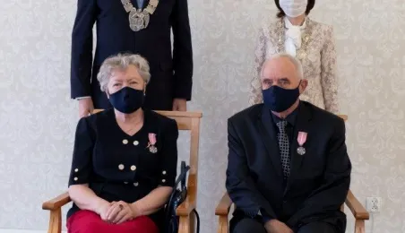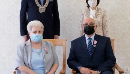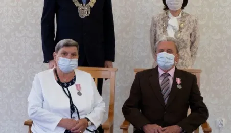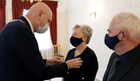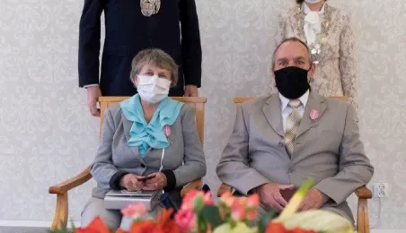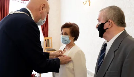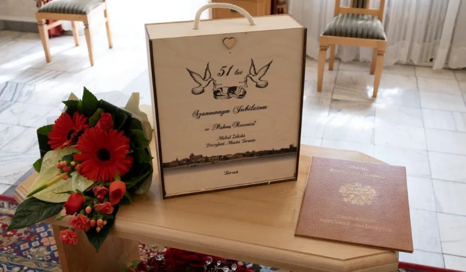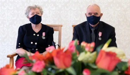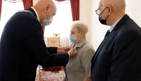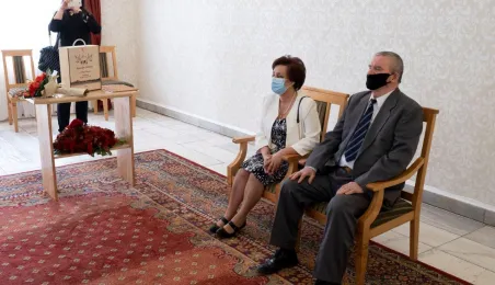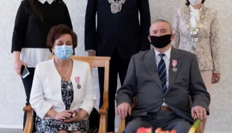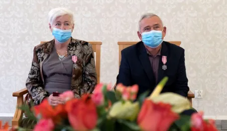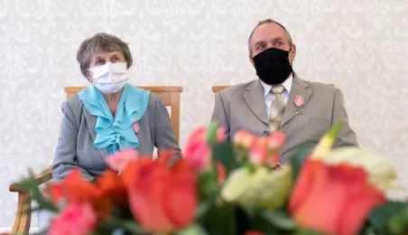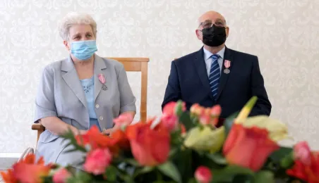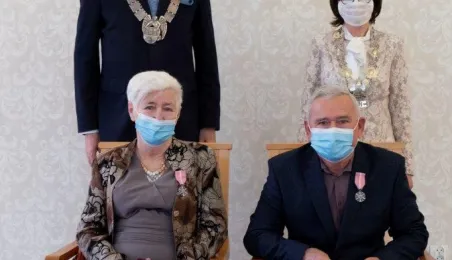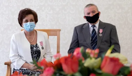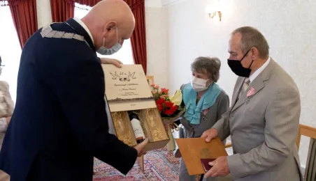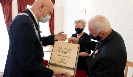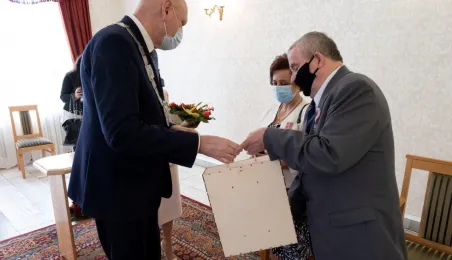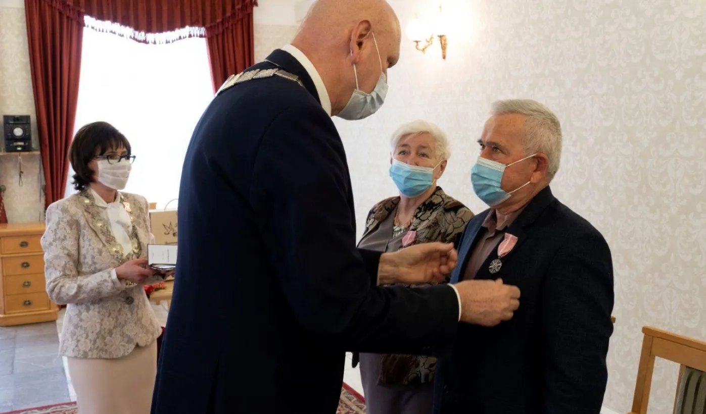 Dziesięć par małżeńskich odebrało w dniu 27 maja 2021 r. zaległe Medale za Długoletnie Pożycie Małżeńskie - w 51. rocznicę zawarcia związku małżeńskiego. Medale w sali ślubów Urzędu Stanu Cywilnego wręczył prezydent Michał Zaleski – z zachowaniem rygorów sanitarnych. Fot. Wojtek Szabelski