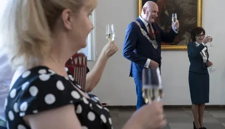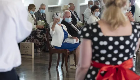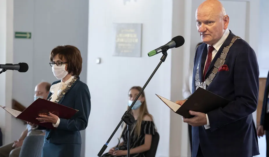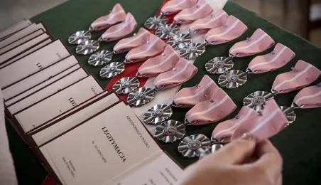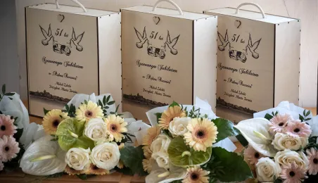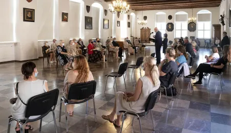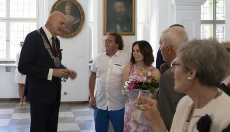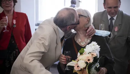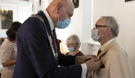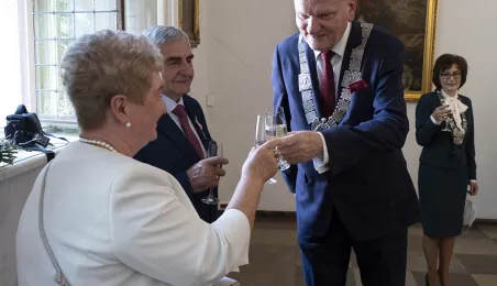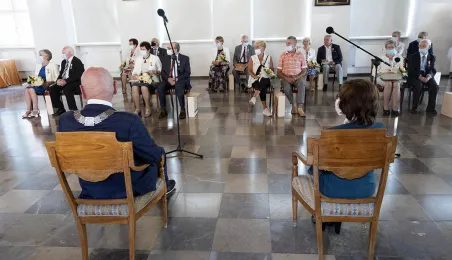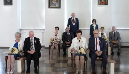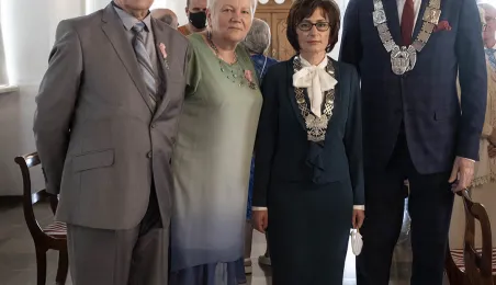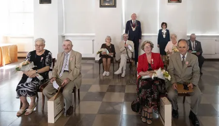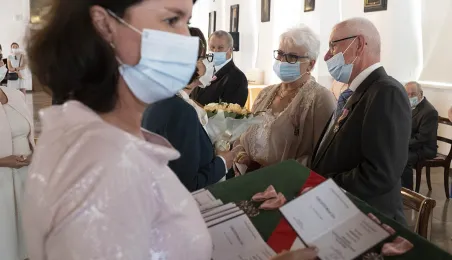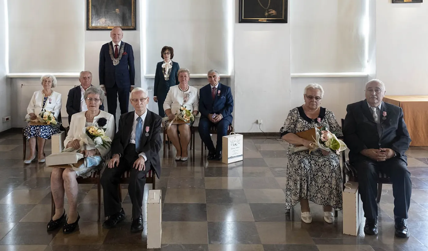 W Ratuszu Staromiejskim w Toruniu 6 lipca 2021 roku 18 par małżeńskich zostało odznaczonych Medalami za Długoletnie Pożycie Małżeńskie. Po ponad roku przerwy spowodowanej pandemią kilka tygodni temu powrócono w Toruniu do tej pięknej tradycji, przy zachowaniu niezbędnych środków ostrożności. 6 lipca odznaczenia odebrały z rąk prezydenta Torunia Michała Zaleskiego dwie, 9-osobowe grupy jubilatów – o godz. 14.00 i 15.30. Fot. Wojtek Szabelski