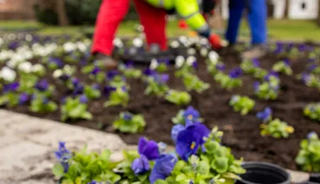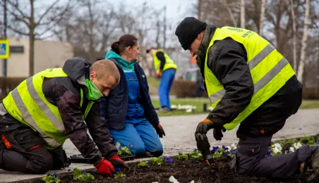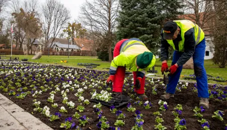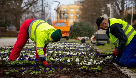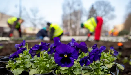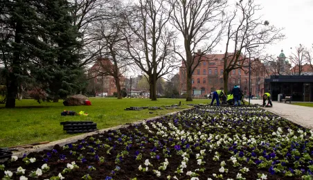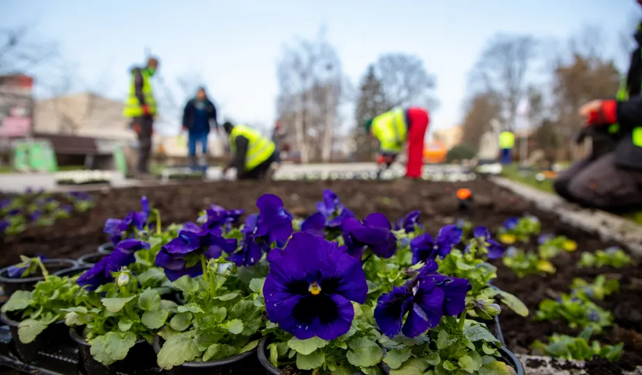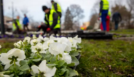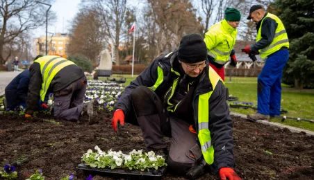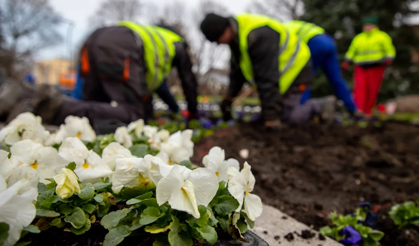 Na rabatach na terenie Zielonej Bramy Gotyckiej Starówki nasadzono białe i niebieskie bratki. Jest to kontynuacja jesiennej wymiany kwiatów jednorocznych w rejonie Urzędu Miasta i Muzeum Etnograficznego. Wówczas, na przełomie listopada i grudnia 2023 r. przyszły przymrozki, które uniemożliwiły wykonywanie dalszy prac. Zdążono jedynie nasadzić kwiaty na rabatach przy ul. Wały gen. Sikorskiego. Łącznie na terenie Zielonej Bramy Gotyckiej Starówki nasadzono ok. 7000 bratków kwitnących w różnych odcieniach koloru niebieskiego oraz w kolorze białym. Fot. Agnieszka Bielecka
