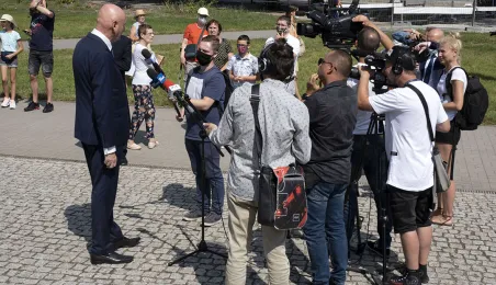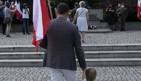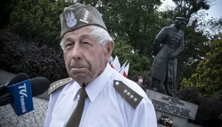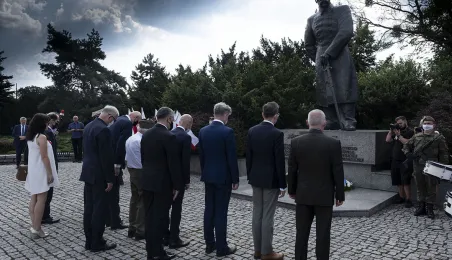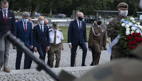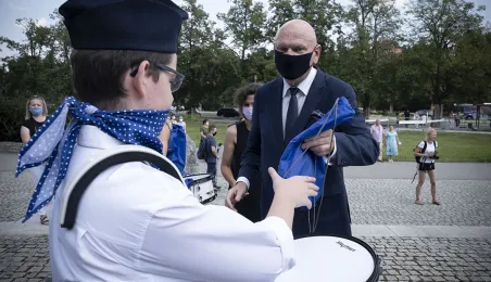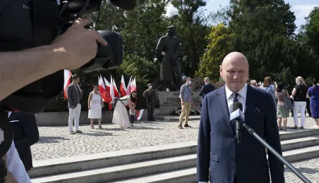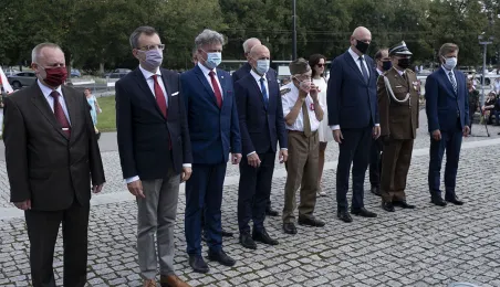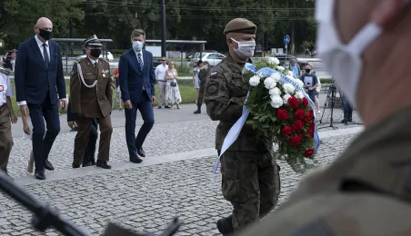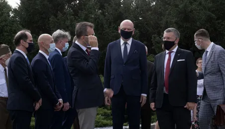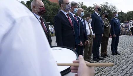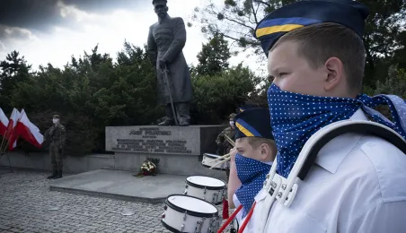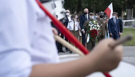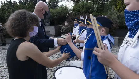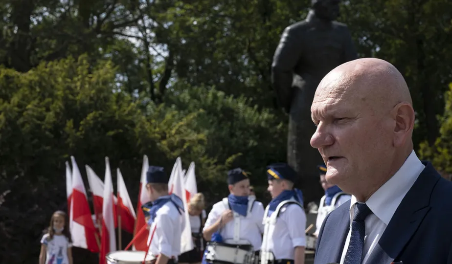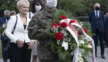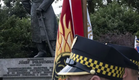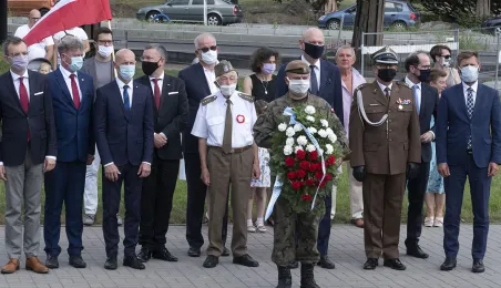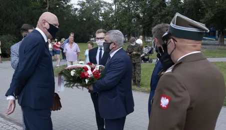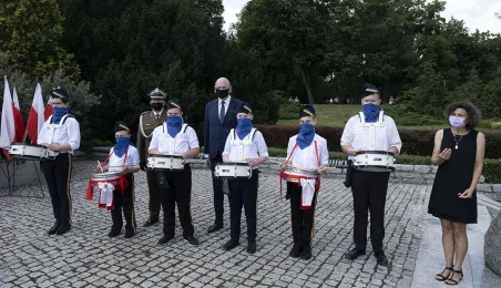 Symboliczne złożenie kwiatów pod pomnikiem marszałka Józefa Piłsudskiego w Toruniu przez wspólną delegację kombatantów, samorządowców, przedstawicieli województwa i toruńskich instytucji uczciło 15 sierpnia 2020 r. 100. rocznicę Bitwy Warszawskiej. Fot. Wojtek Szabelski