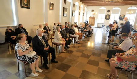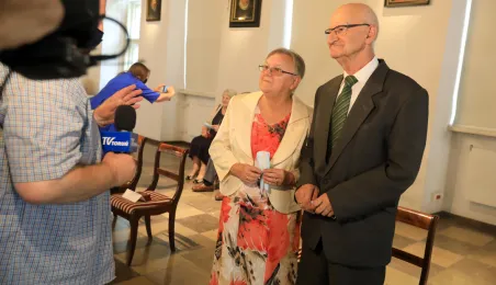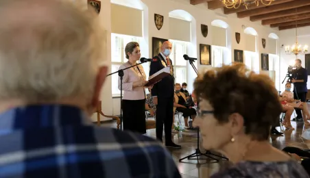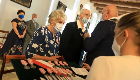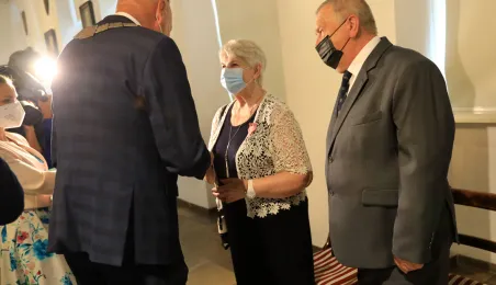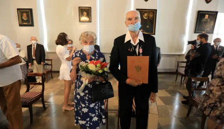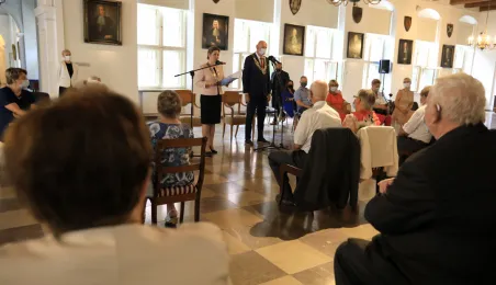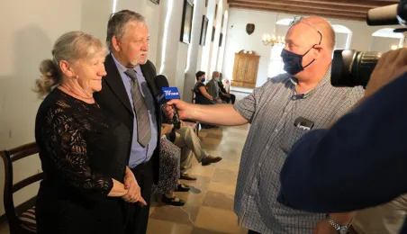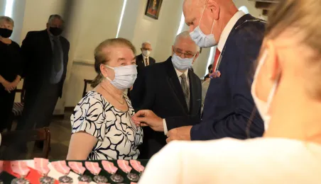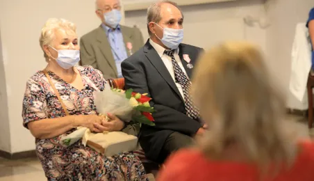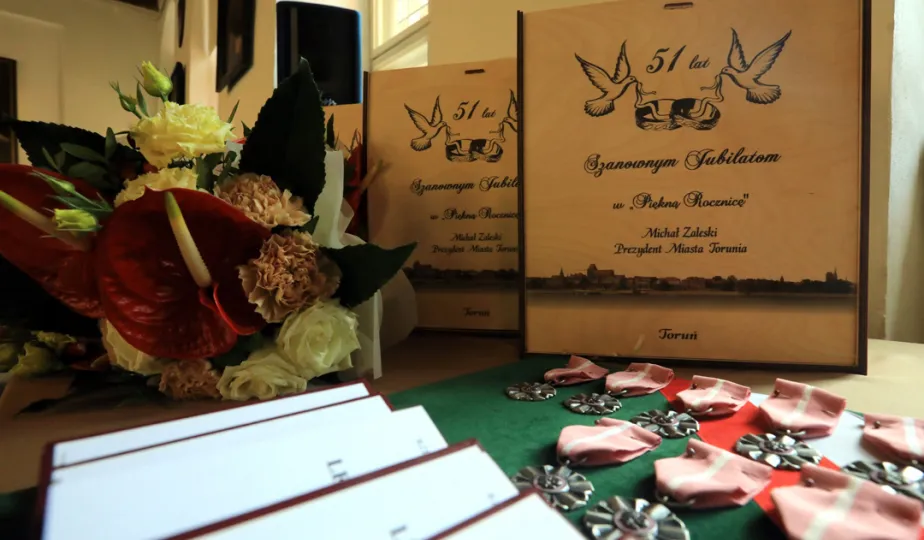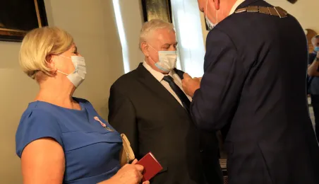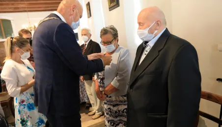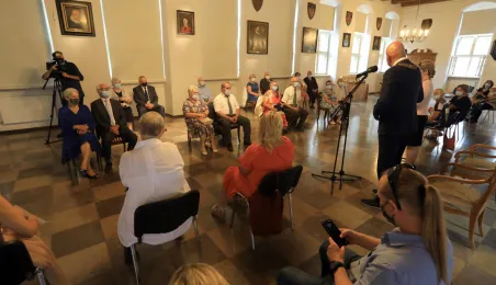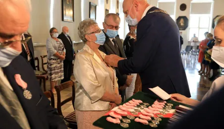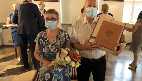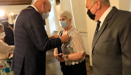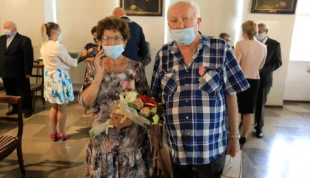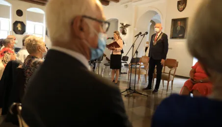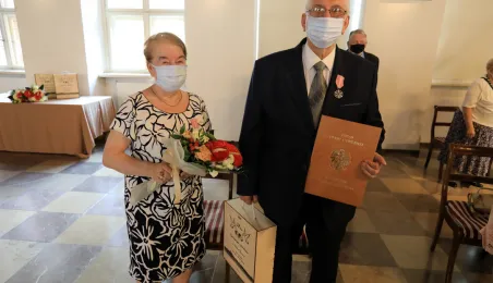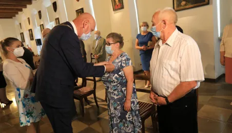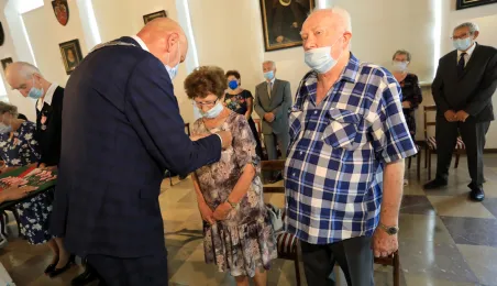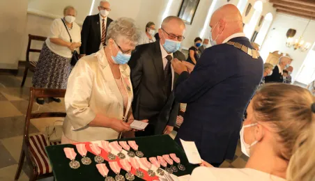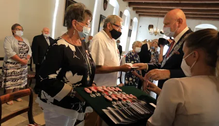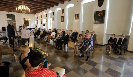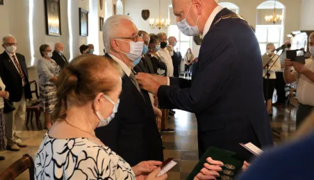 18 par małżeńskich zostało 20 lipca 2021 roku odznaczonych Medalami za Długoletnie Pożycie Małżeńskie. Uroczystość wręczenia odznaczeń odbyła się w Ratuszu Staromiejskim w Toruniu. Jubilaci, którzy otrzymali z rąk prezydenta Torunia odznaczenia państwowe, mają na koncie co najmniej 50 lat małżeńskiego stażu. Fot. Sławomir Kowalski