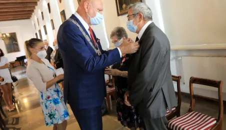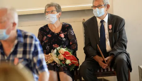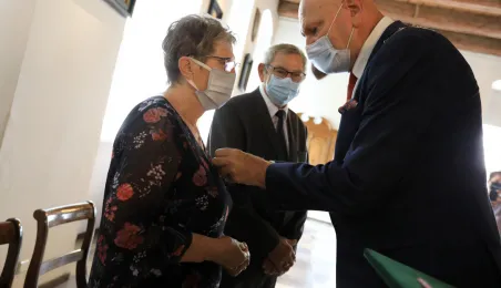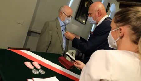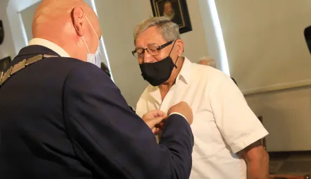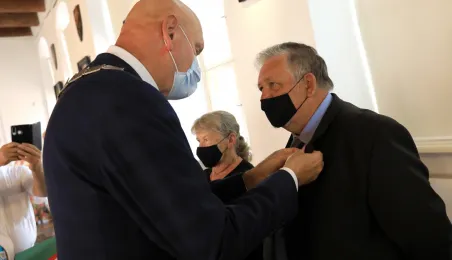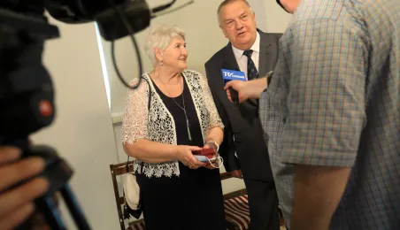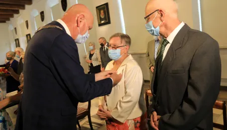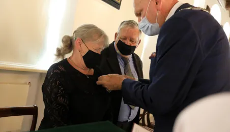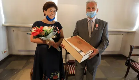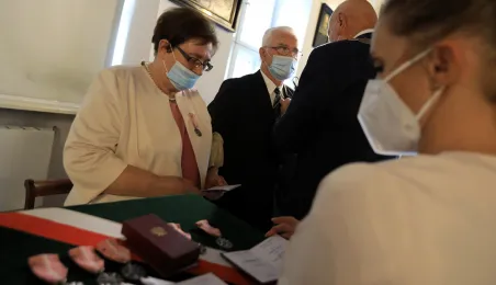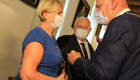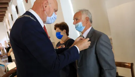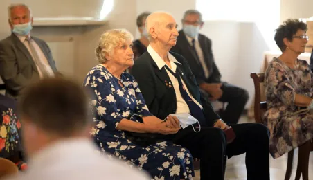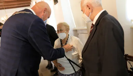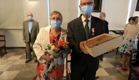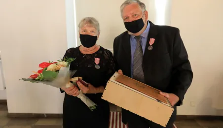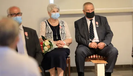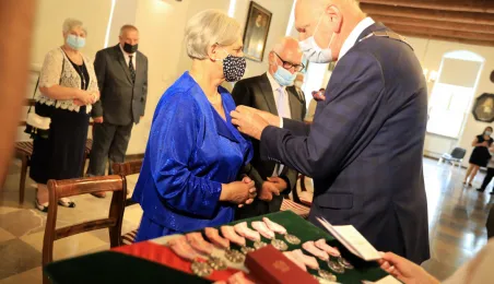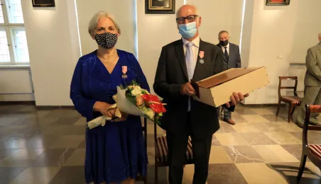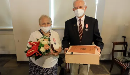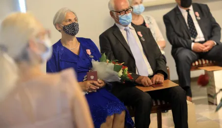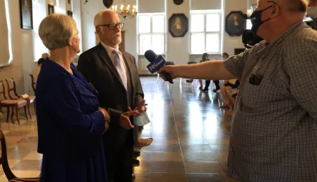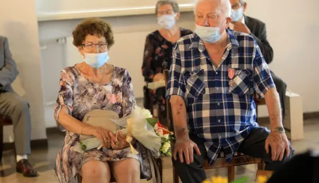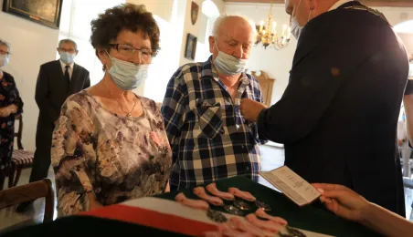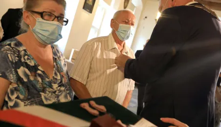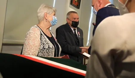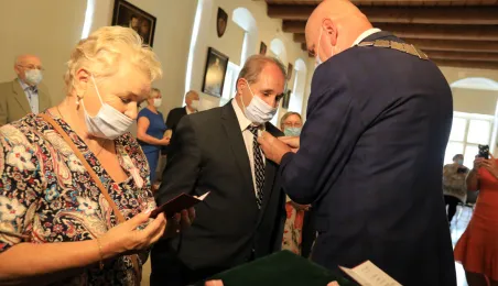 18 par małżeńskich zostało 20 lipca 2021 roku odznaczonych Medalami za Długoletnie Pożycie Małżeńskie. Uroczystość wręczenia odznaczeń odbyła się w Ratuszu Staromiejskim w Toruniu. Jubilaci, którzy otrzymali z rąk prezydenta Torunia odznaczenia państwowe, mają na koncie co najmniej 50 lat małżeńskiego stażu. Fot. Sławomir Kowalski