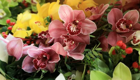 • Fragment łąki kwietnej. CZerwone, żółte i fioletrowe kwiaty w zielonej trawie.