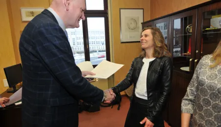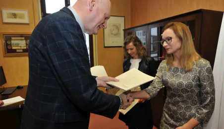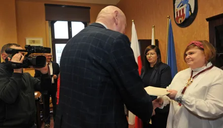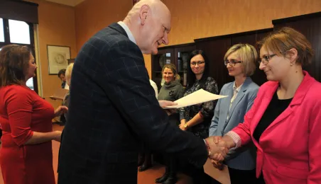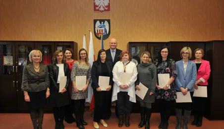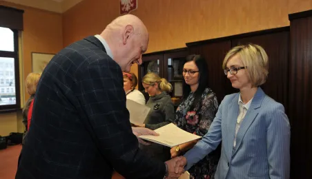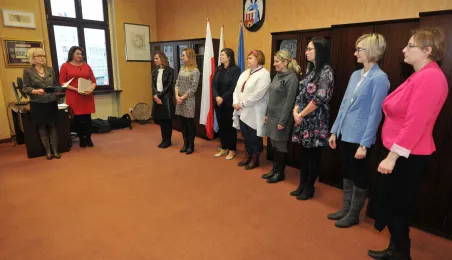 Osiem toruńskich nauczycielek odebrało z rak prezydenta Michała Zaleskiego akty nadania stopnia zawodowego nauczyciela mianowanego. Uroczyste wręczenie miało miejsce w dniu 5 lutego 2019 roku w Urzędzie Miasta Torunia. Fot. Małgorzata Litwin