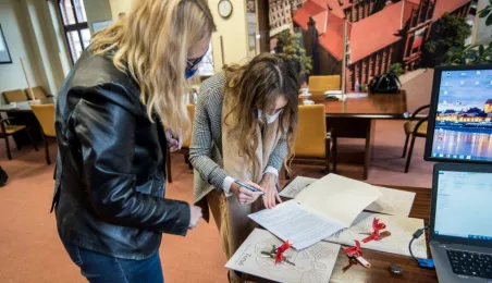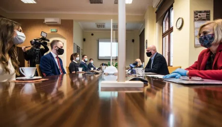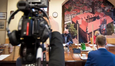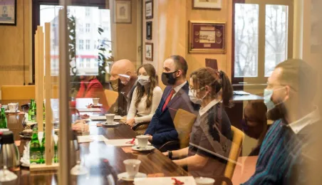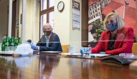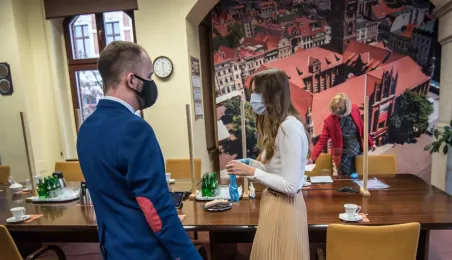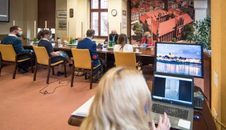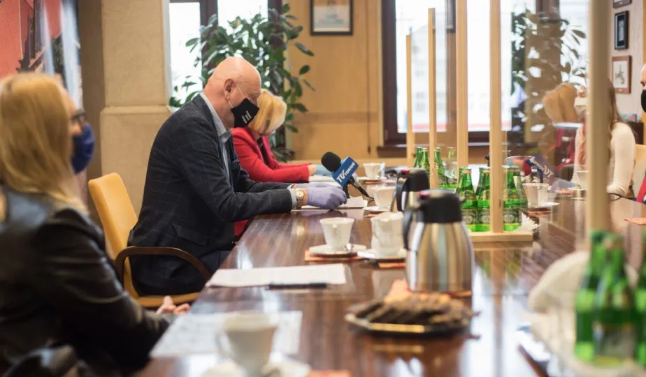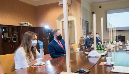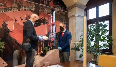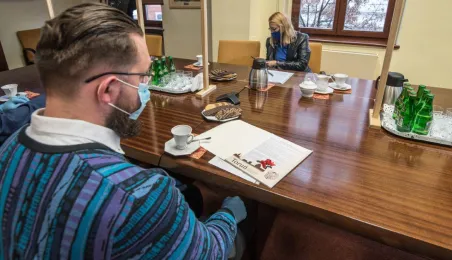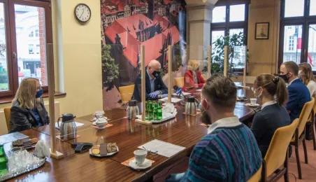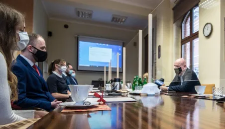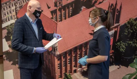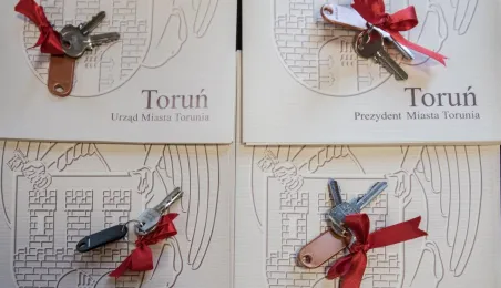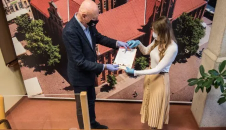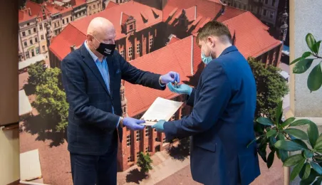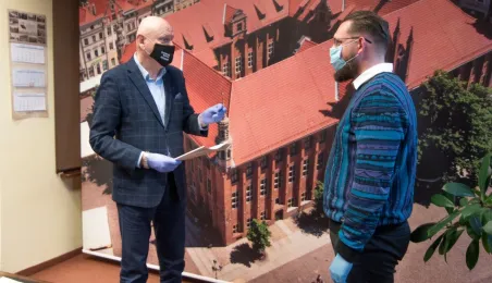 Pięcioro absolwentów UMK odebrało klucze do mieszkań, przyznanych im w ramach programu „Mieszkanie dla absolwenta”. To już szósta edycja miejskiego programu skierowanego do młodych, zdolnych osób. Klucze wraz z umowami najmu wręczył absolwentom prezydent Michał Zaleski podczas spotkania w Urzędzie Miasta Torunia w dniu 26 listopada 2020 r. Spotkanie odbyło się z zachowaniem obowiązujących zasad bezpieczeństwa. Fot. Lech Kamiński