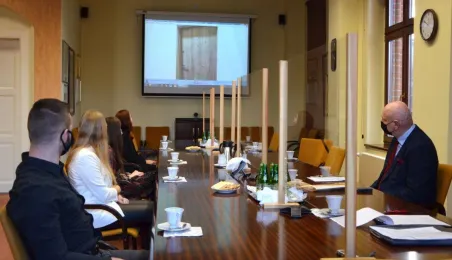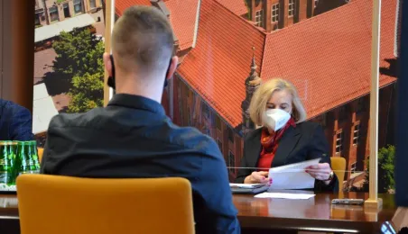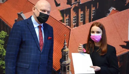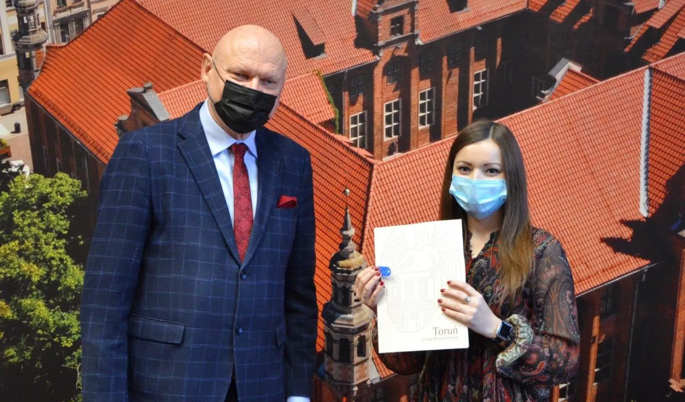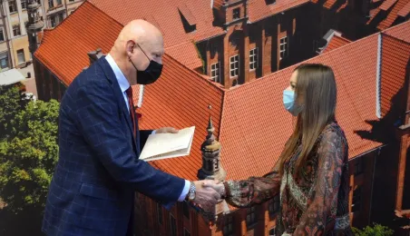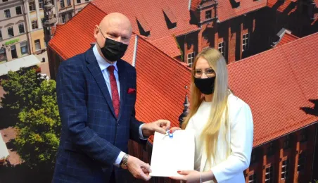 W dniu 21 grudnia 2021 r. prezydent Michał Zaleski wręczył klucze do mieszkań wyróżniającym się absolwentom UMK w ramach programu miejskiego "Mieszkanie dla absolwenta". Spotkanie odbyło się w Urzędzie Miasta Torunia. Fot. Natalia Przytarska