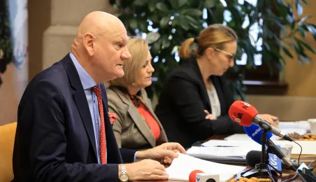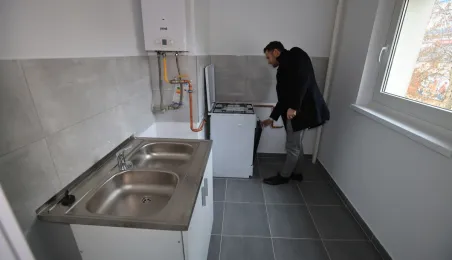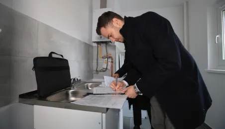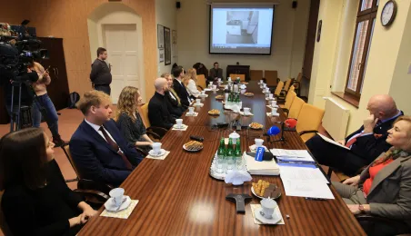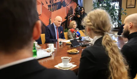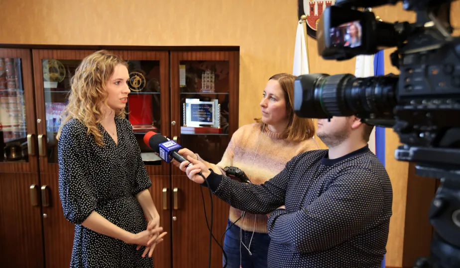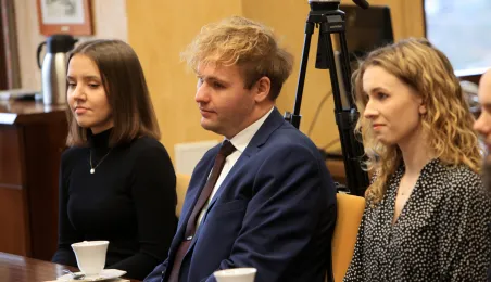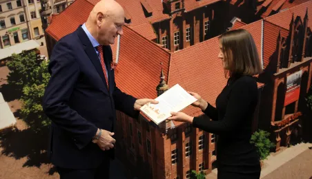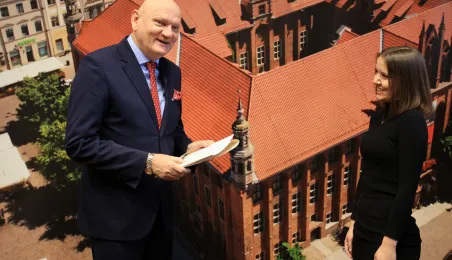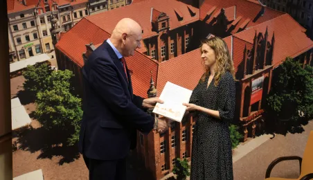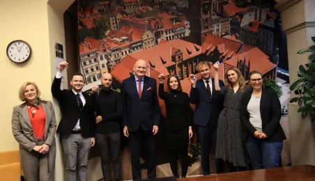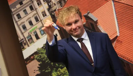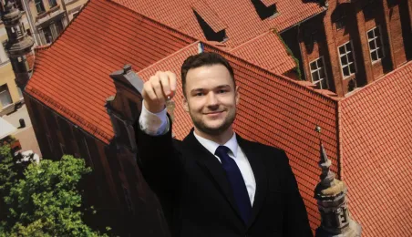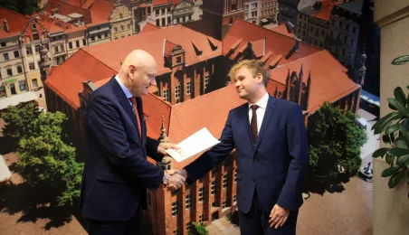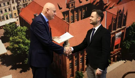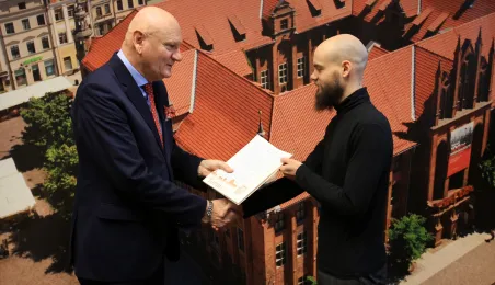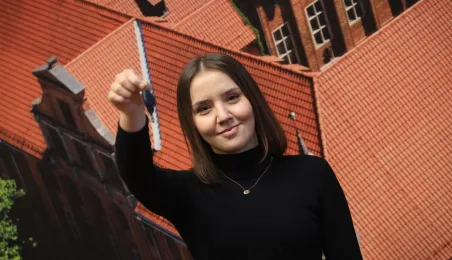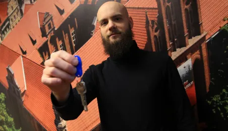 Pięcioro absolwentów UMK odebrało klucze do mieszkań, które będą wynajmować od miasta w ramach programu "Mieszkanie dla absolwenta". Wręczył je, wraz z umowami najmu, prezydent Michał Zaleski w 16 grudnia 2022 r. Fot. Sławomir Kowalski