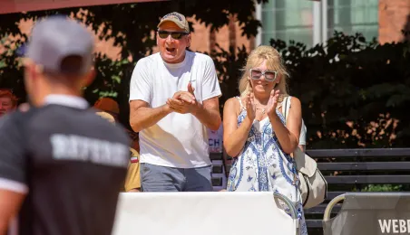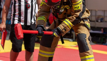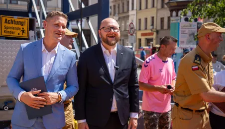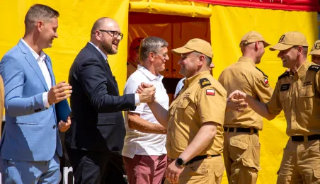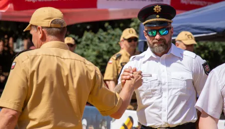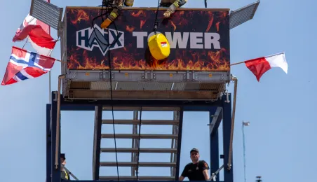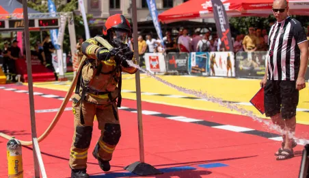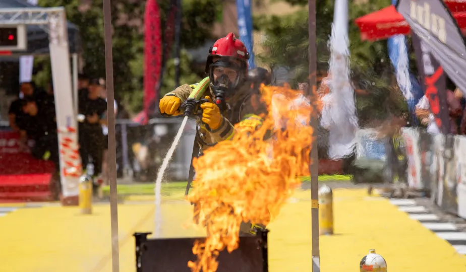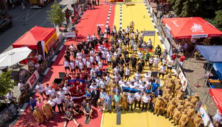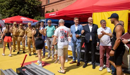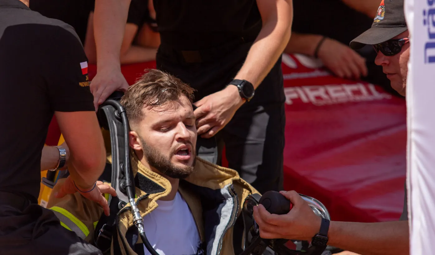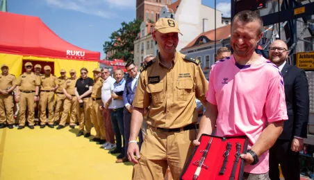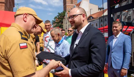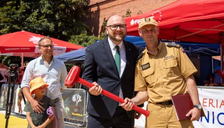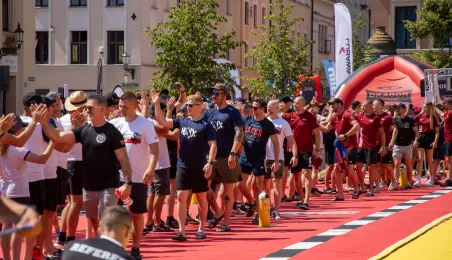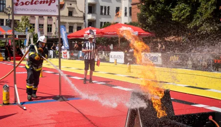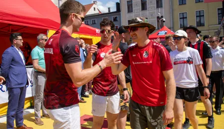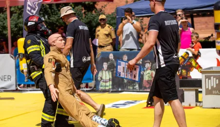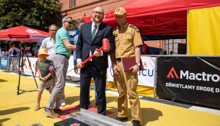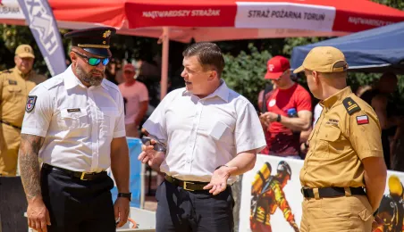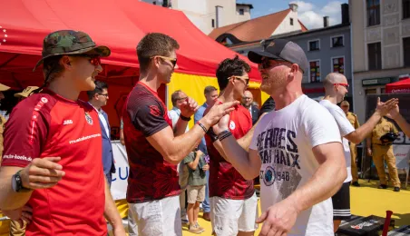 Na toruńskiej starówce rozpoczęły się w czwartek 27 czerwca 2024 r. zmagania strażaków w Mistrzostwach Polski i Europy o tytuł Najtwardszego Strażaka. Bierze w nich udział ponad 300 zawodników z całego świata: Polski, Czech, Estonii, Litwy, Niemiec, Francji, Słowacji, Wielkiej Brytanii, a nawet z Kanady. Strażacy startują w konkurencjach indywidualnych, w tandemach i w sztafetach. Gościem inauguracji wydarzenia był prezydent Torunia Paweł Gulewski. Fot. © UMT 2024, autor: Agnieszka Bielecka, licencja: CC BY-NC 4.0