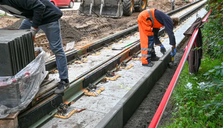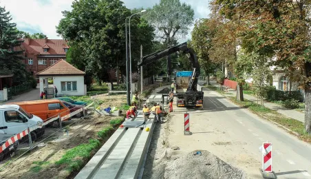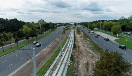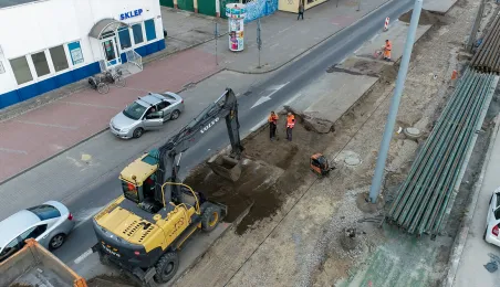 Na ul. Bydgoskiej, na odcinku od ul. Reja do ul. Sienkiewicza, niemal gotowa jest płyta podtorowa i trwa montaż szyn. Ustawiono już większość słupów trakcyjnych. Wykonawca planuje zakończyć prace w grudniu 2021. Na odcinku od ul. Sienkiewicza do Chopina usuwane są kolizje z sieciami podziemnymi. Zakończenie robót na tym etapie planowane jest w sierpniu 2022 r. Na Szosie Lubickiej, na odcinku od pl. Daszyńskiego do ul. Ślaskiego, kontynuowane są prace przy budowie toru północnego. Fot. MZK