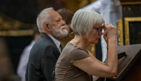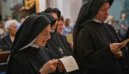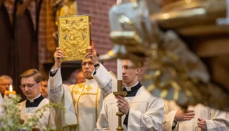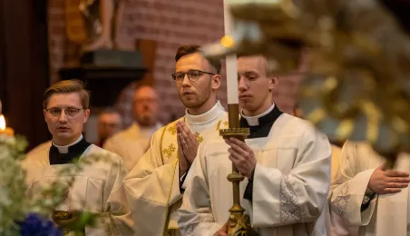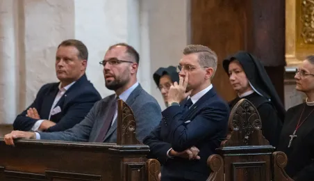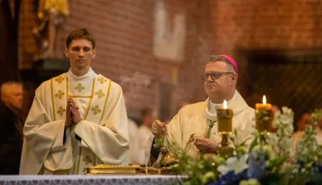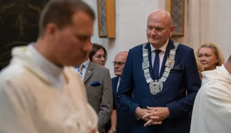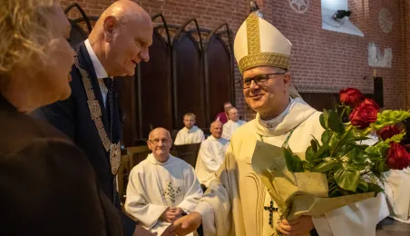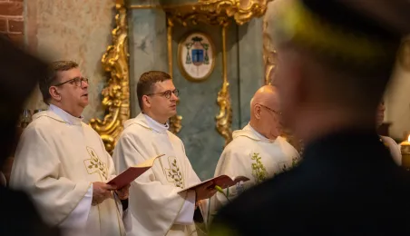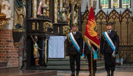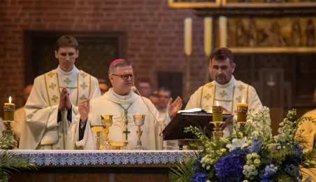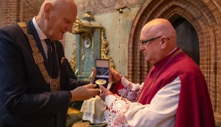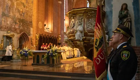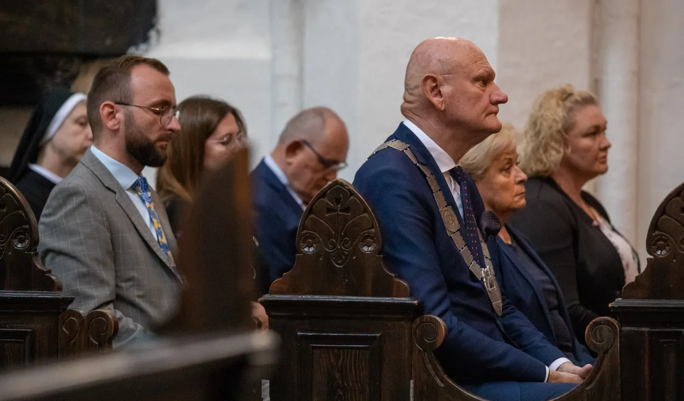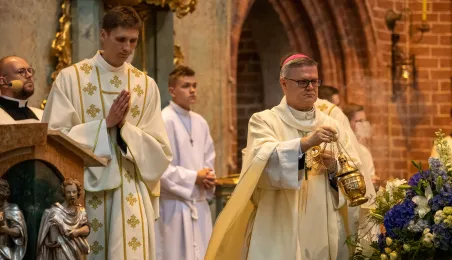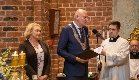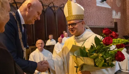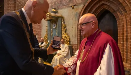 Tradycyjnie z okazji Święta Miasta w katedrze śś. Janów 24 czerwca 2023 r. sprawowana była msza św. w intencji miasta Torunia i jego mieszkańców. Prezydent wręczył ks. prałatowi Markowi Rumińskiemu Medal Pamiątkowy Roku Mikołaja Kopernika (1473-2023), nadany parafii katedralnej. Fot. Agnieszka Bielecka