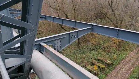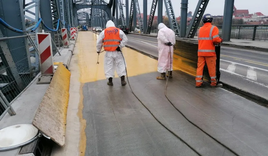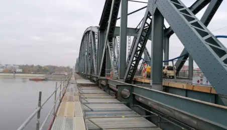Na moście im. Józefa Piłsudskiego trwa montaż wsporników pod przyszły ciąg pieszo-rowerowy. Obecnie są one zakładane nad nurtem rzeki przy wykorzystaniu podwieszanych rusztowań. Wykonywane są też prace antykorozyjne, podczas których, w celu zapewnienia odpowiedniej temperatury w warunkach zimowych wykonawca używa nagrzewnic i osuszaczy. Fot. Miejski Zarząd Dróg