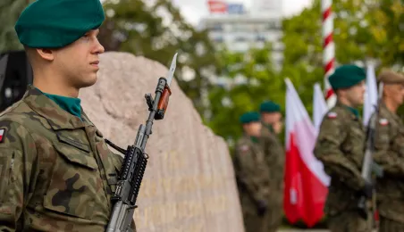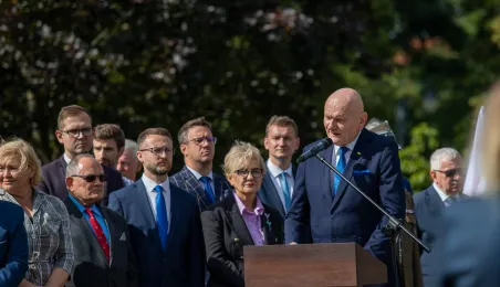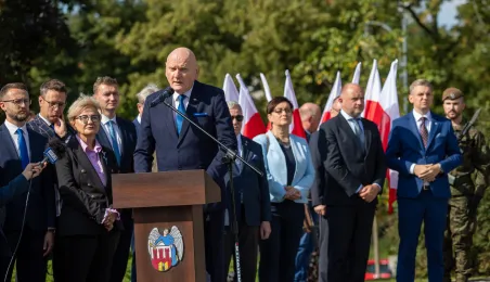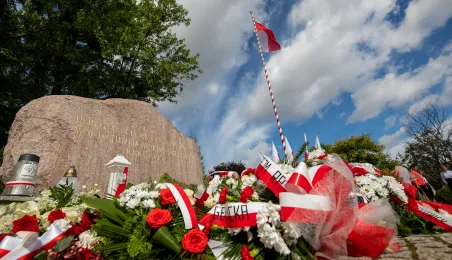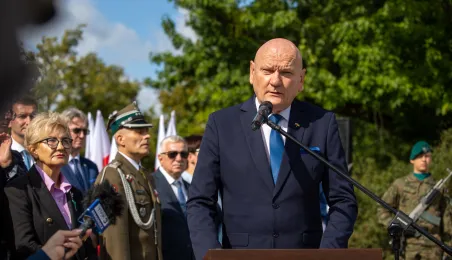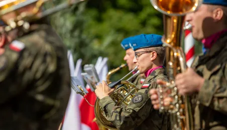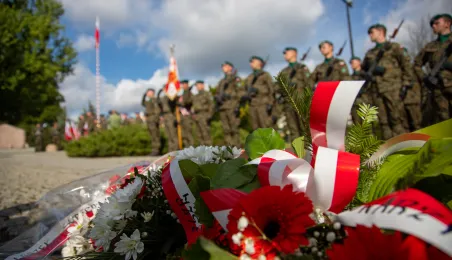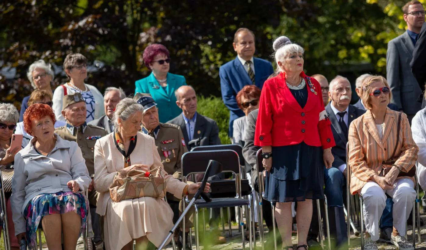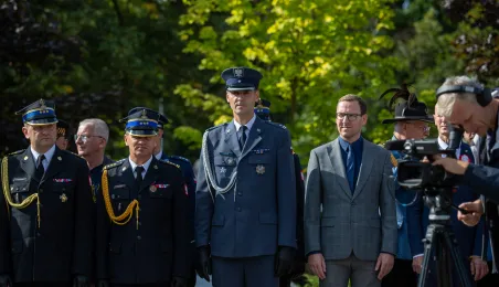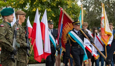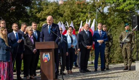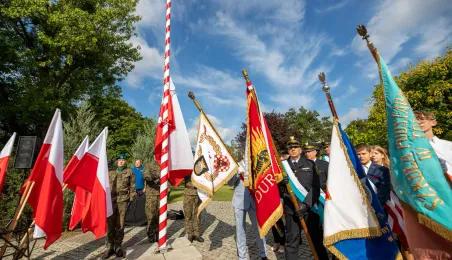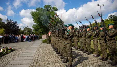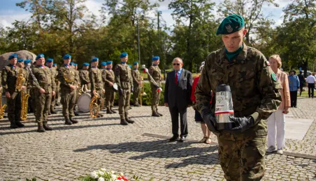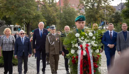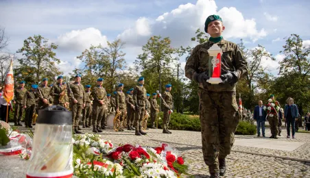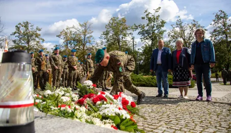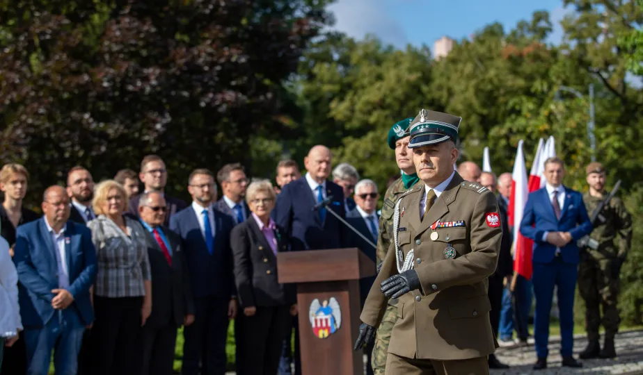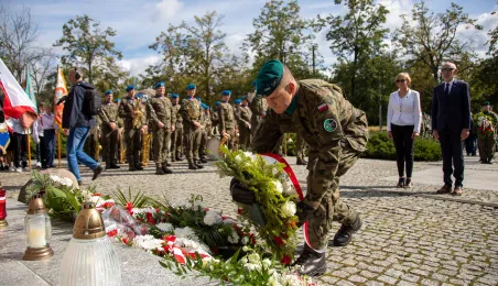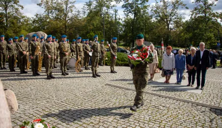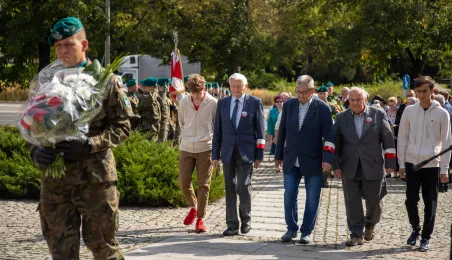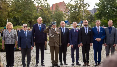 Przy obelisku „Ku czci poległych i pomordowanych przez hitlerowskiego najeźdźcę w latach 1939-1945” na Skwerze im. Oficerskiej Szkoły Artylerii w Toruniu odbyła się uroczystość patriotyczna z okazji 84. rocznicy wybuchu II wojny światowej. Fot. Agnieszka Bielecka