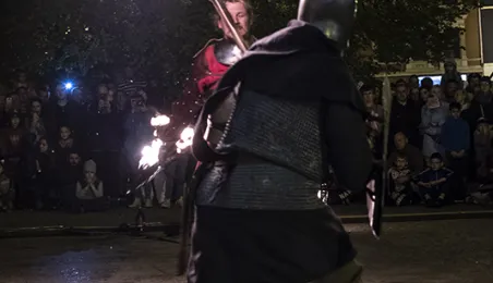 W ramach tegorocznej majówki 2 maja 2018 r. na Rynku Staromiejskim można było zobaczyć pokazy walk z ogniem w wykonaniu Bohemica Sanguis, Okorskiej Gardy i Roty Zbrojnej Grodu Lubicz. Fot. Wojtek Szabelski
