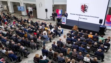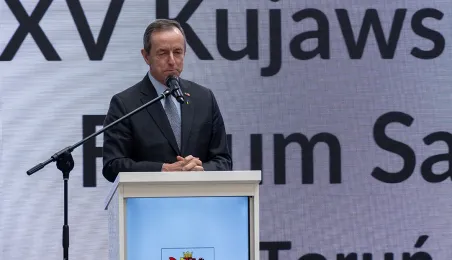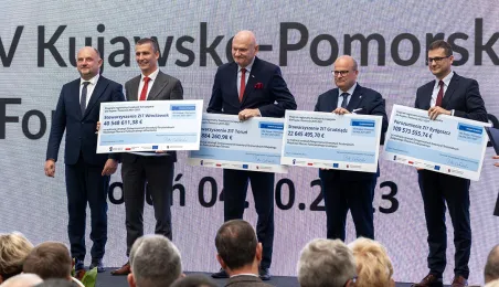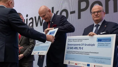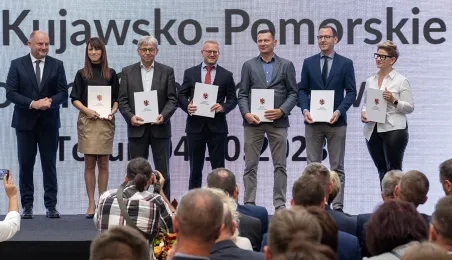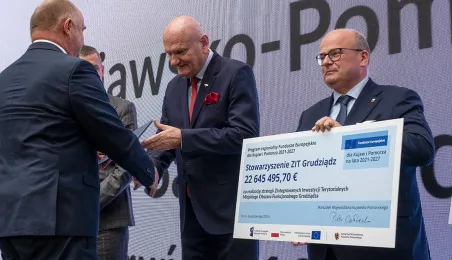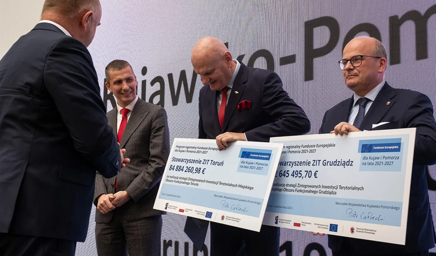 4 października 2023 r. w Toruniu obraduje Forum Samorządowe Województwa Kujawsko-Pomorskiego. Prezydent Michał Zaleski odebrał symboliczny czek na blisko 85 mln euro dotacji dla Stowarzyszenia ZIT Toruń. Wśród gości znaleźli się m.in. marszałek Senatu Tomasz Grodzki, posłowie na Sejm: Iwona Michałek, Arkadiusz Myrcha, Władysław Kosiniak-Kamysz, a także senator Ryszard Bober. Fot. Wojtek Szabelski