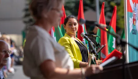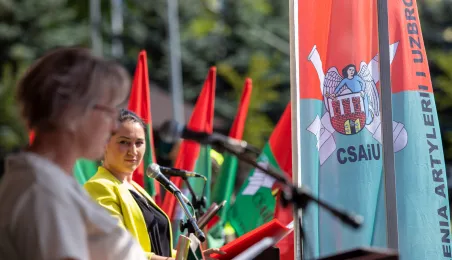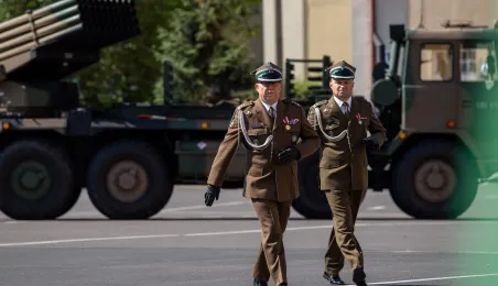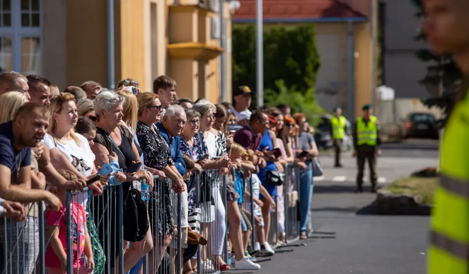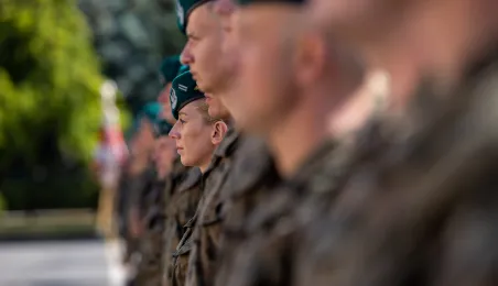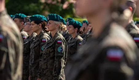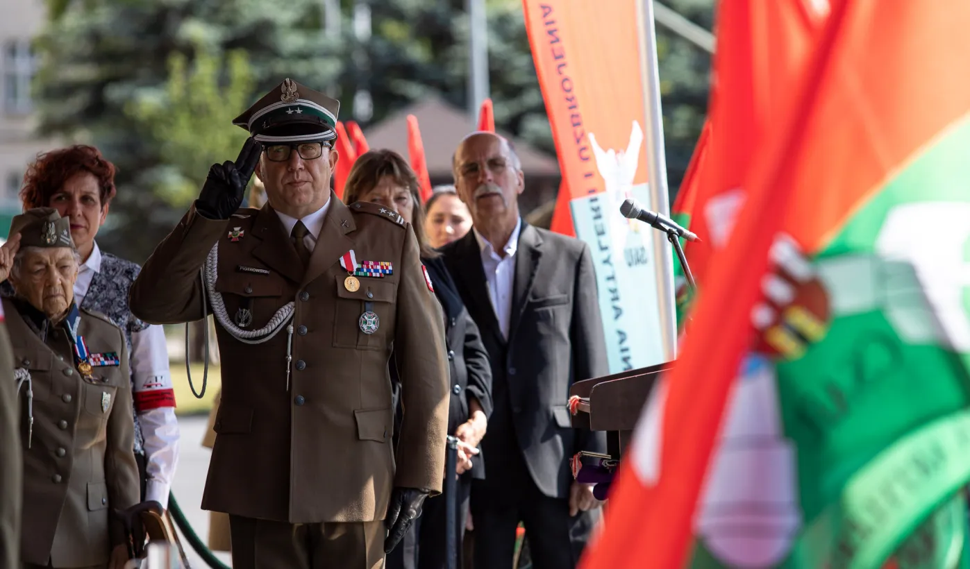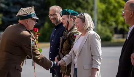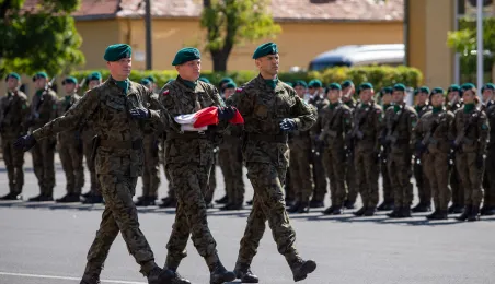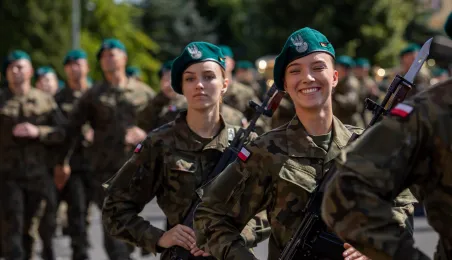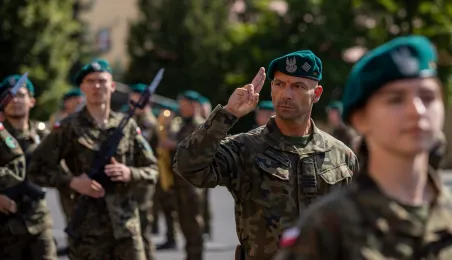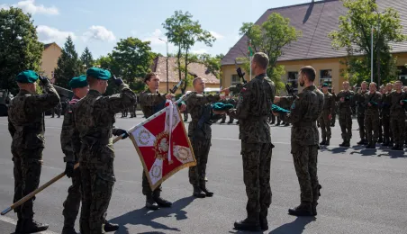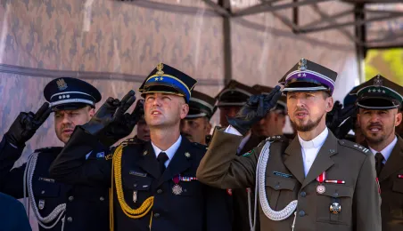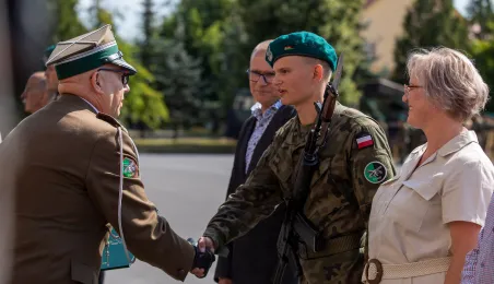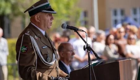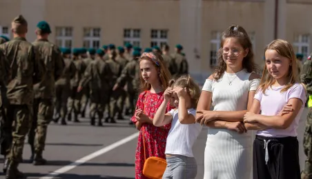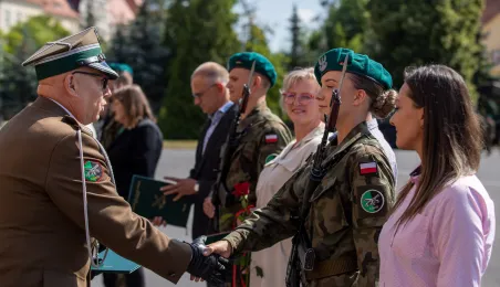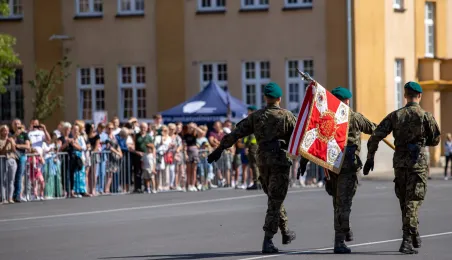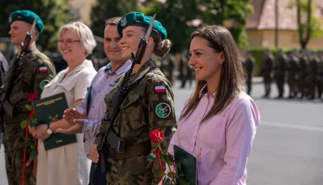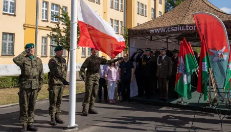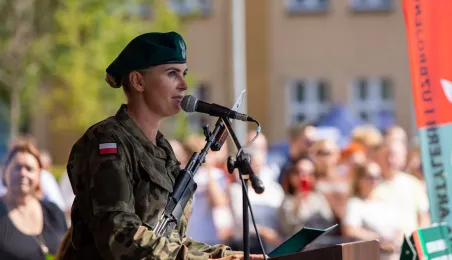 Zgodnie z ceremoniałem wojskowym i przy akompaniamencie Orkiestry Wojskowej z Torunia, w sobotę 29 lipca 2023 r. na placu apelowym Centrum Szkolenia Artylerii i Uzbrojenia w Toruniu przysięgę złożyło 54 ochotników projektu "Trenuj jak żołnierz". Fot. Agnieszka Bielecka